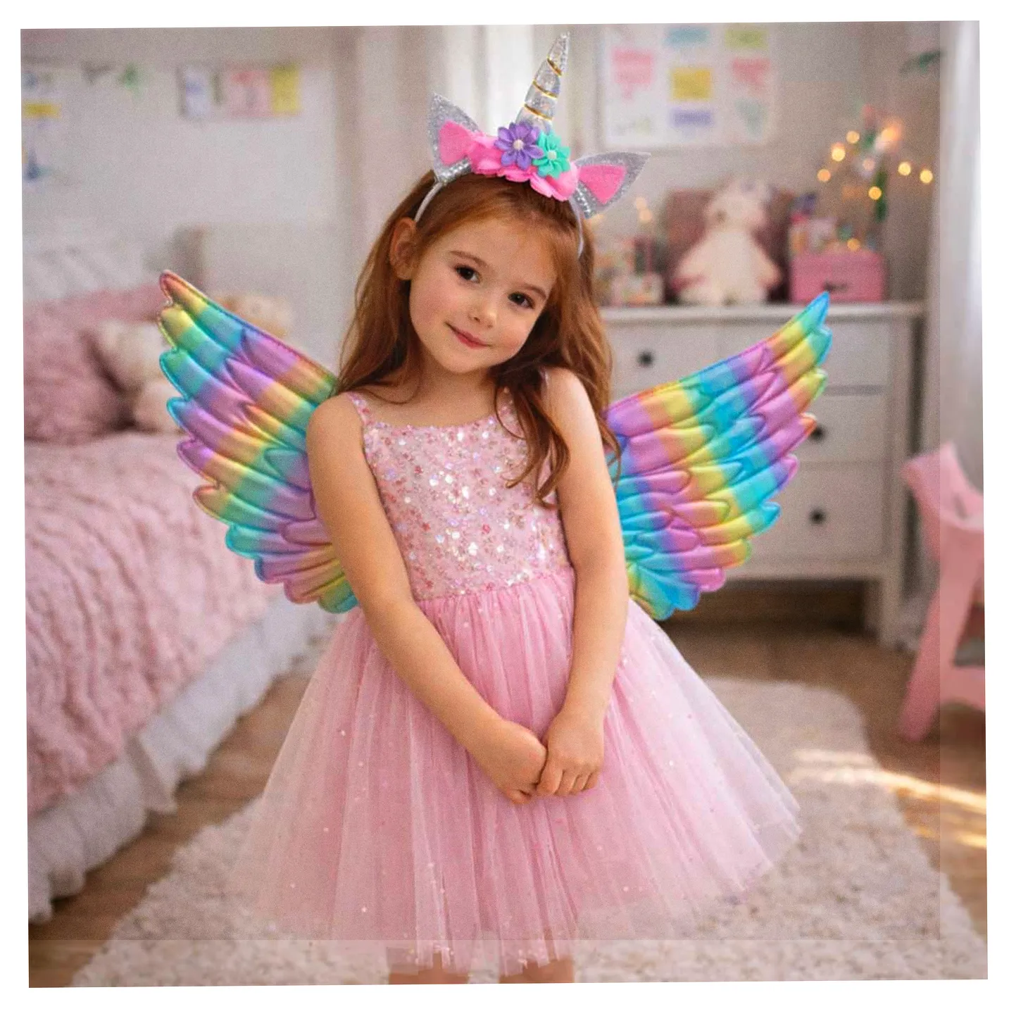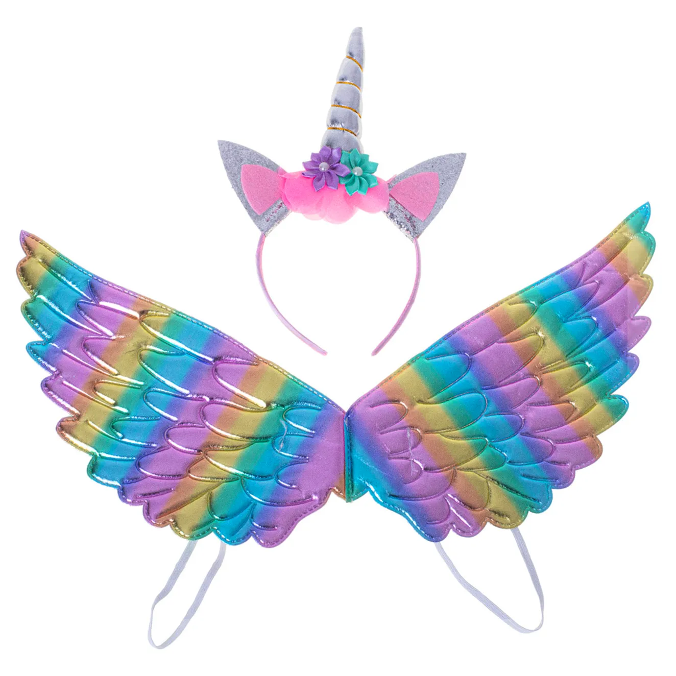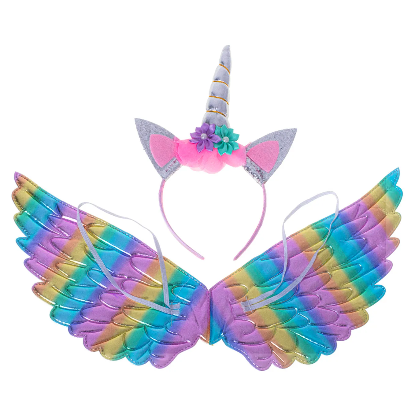 Fantastyczny kostium jednorożca na bal przebierańców, na Halloween czy też na imprezę tematyczną. W zestawie znajduje się opaska z cekinowymi uszkami i rogiem oraz tęczowe skrzydła. Wym. skrzydeł: 43 x 23 cm. Wys. rogu: 12 cm.