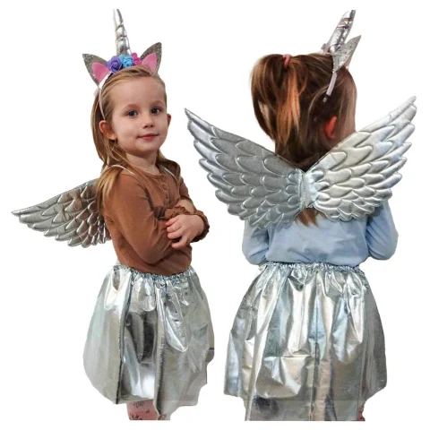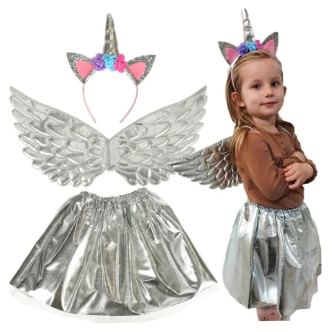 Kostium jednorożca to zestaw dla dzieci 3+, w skład którego wchodzi spódniczka, lekkie skrzydła i elastyczna opaska. Regulowany pas ułatwia dopasowanie, strój jest wygodny podczas długiej zabawy i idealny na bal przebierańców i imprezy