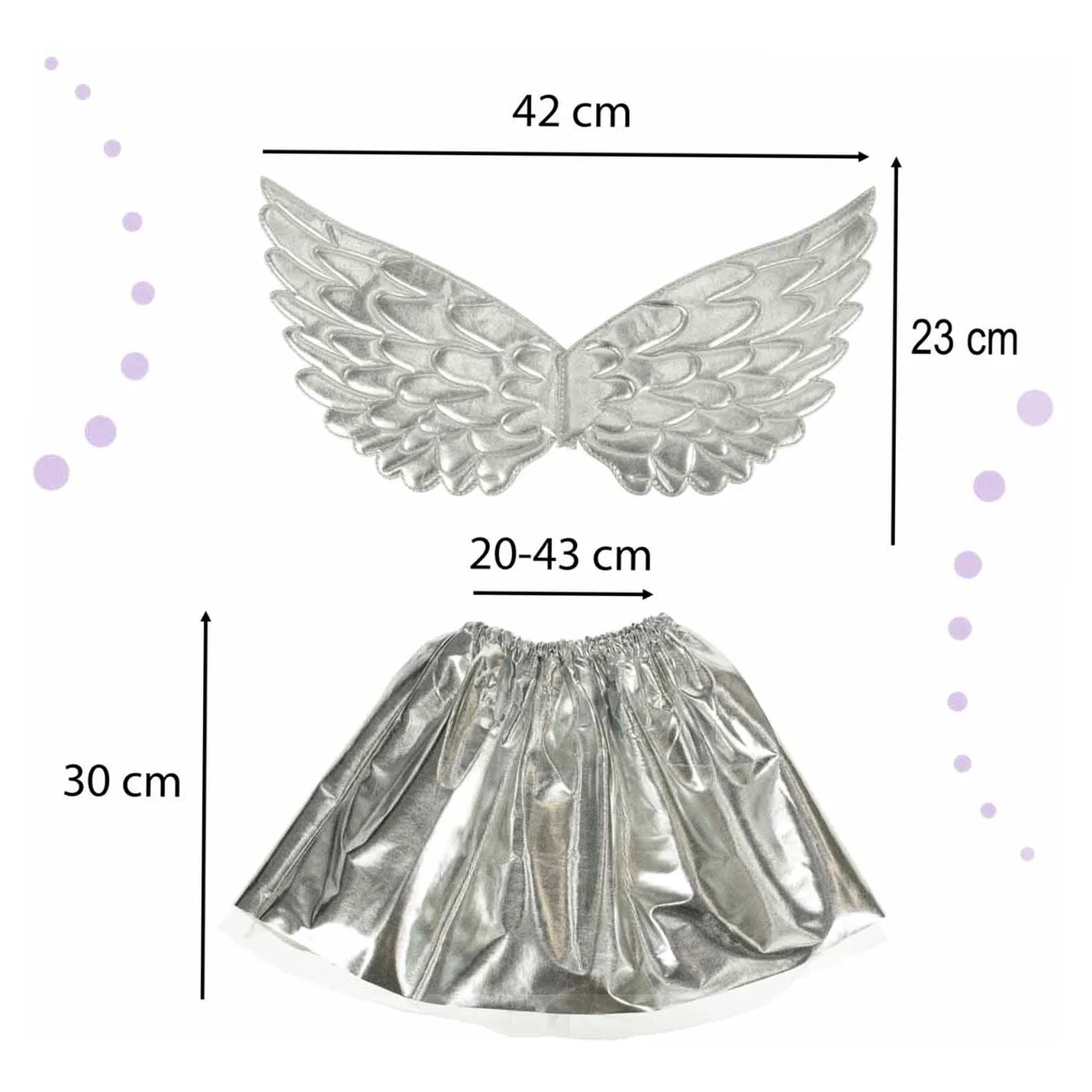 • Spódniczka: Szerokość w pasie: 20-43 x2 cm, Długość 30 cm, Długość z siateczką: 34 cm