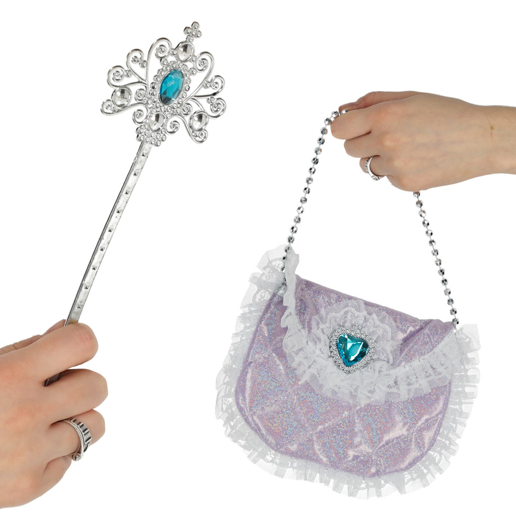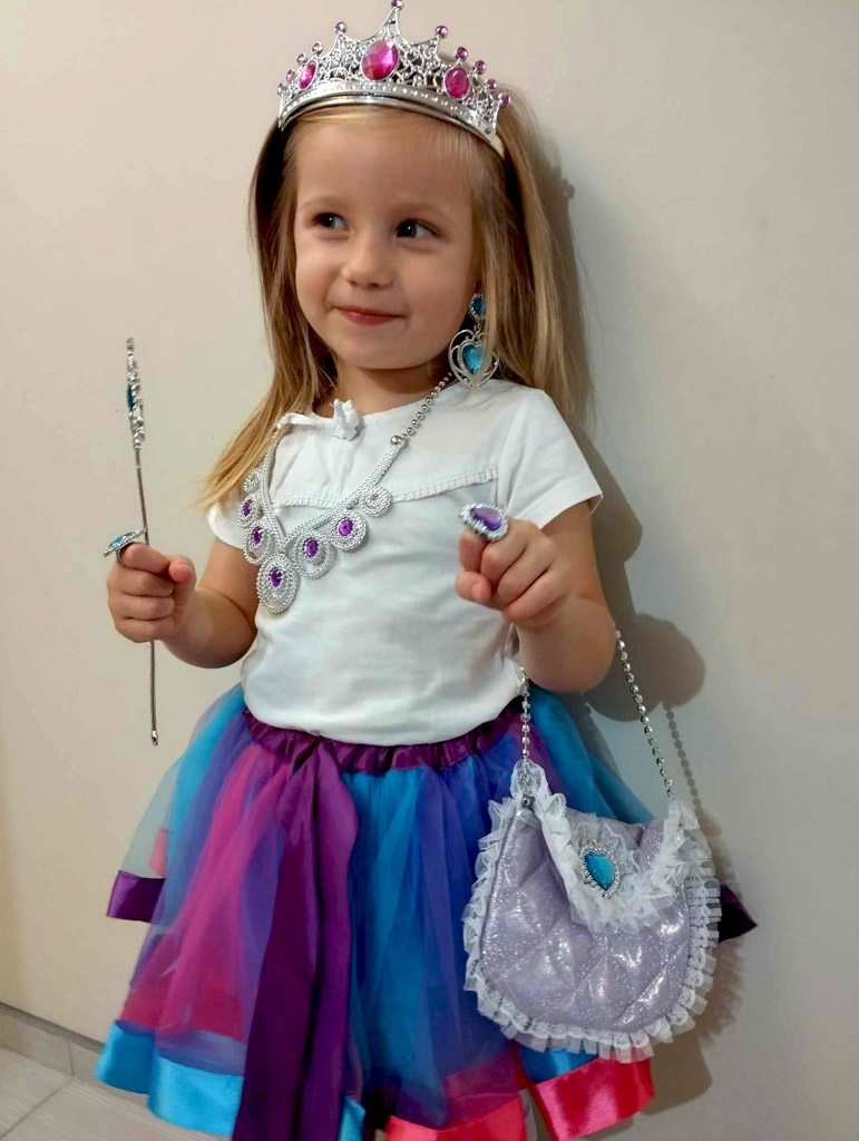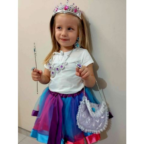 Zestaw księżniczki zawiera lekką spódniczkę z warstwową tkaniną, koronę, różdżkę, zamykaną torebkę na drobiazgi oraz komplet biżuterii. Zestaw kostium + akcesoria idealnie sprawdzi się jako przebranie karnawałowe lub do codziennej zabawy.