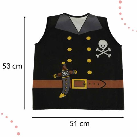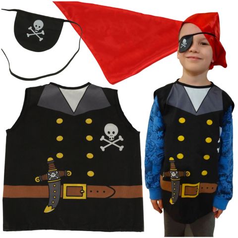 Zestaw obejmuje strój pirata zapinany na rzep, chustę i opaskę na oko. Idealny na karnawałowy bal przebierańców. Wymiary stroju 53×47 cm. Świetny do kreatywnej zabawy i odgrywania przygód, w których mały pirat żeglarz przejmuje stery.