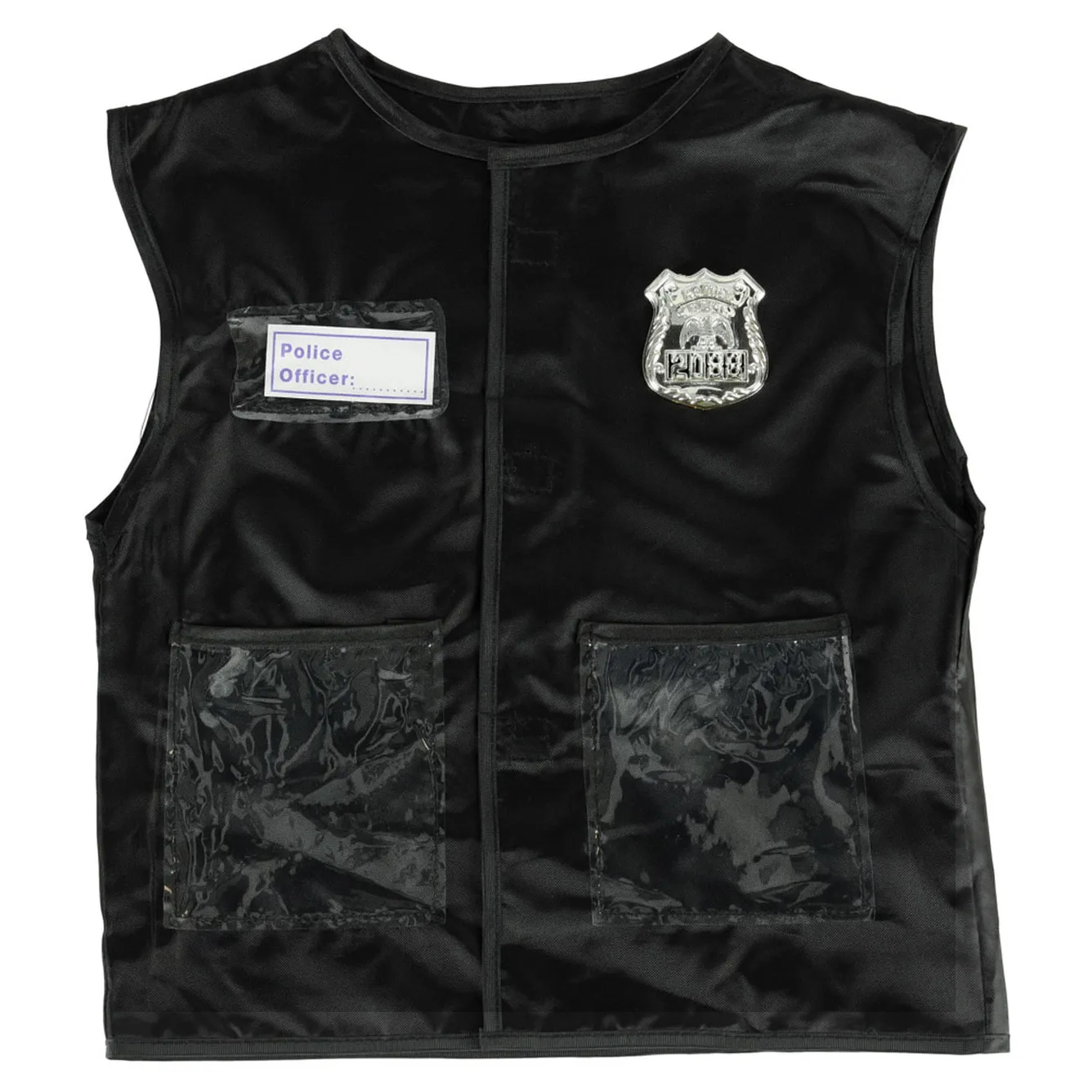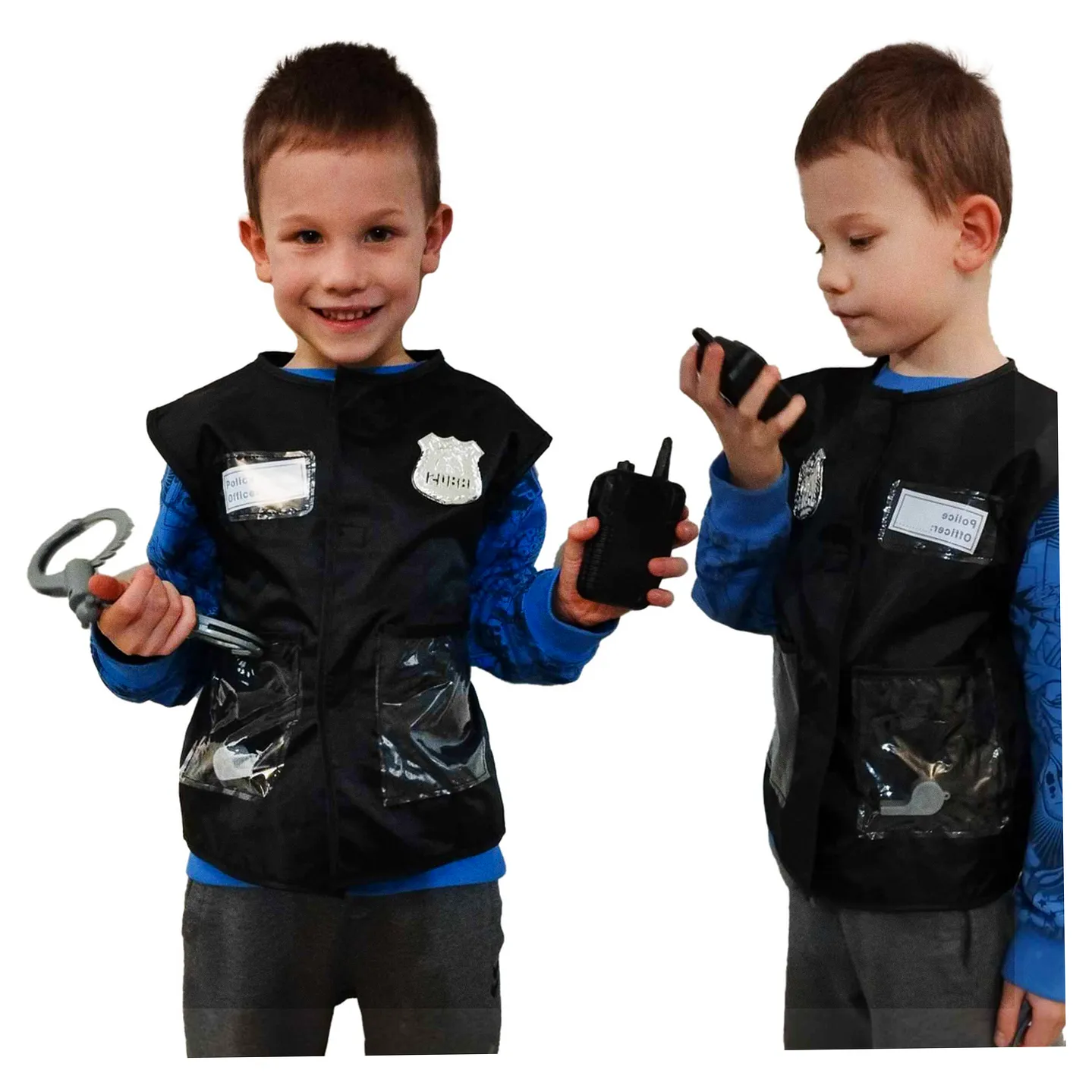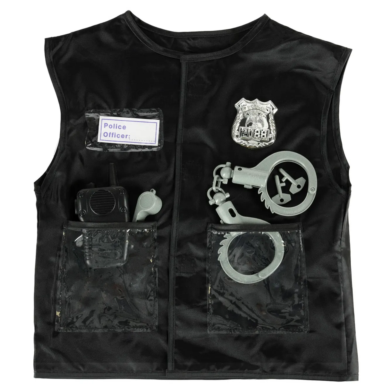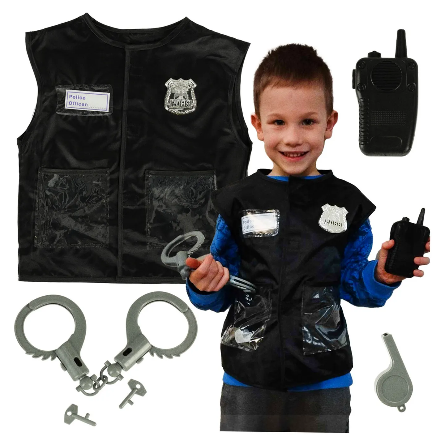Zestaw policyjny dla dzieci obejmuje lekką kamizelkę, kajdanki z kluczykami, gwizdek oraz krótkofalówkę-rekwizyt podkreślającą charakter zabawy. Elementy wykonane z trwałych materiałów zapewniają komfort i bezpieczeństwo podczas aktywnej zabawy