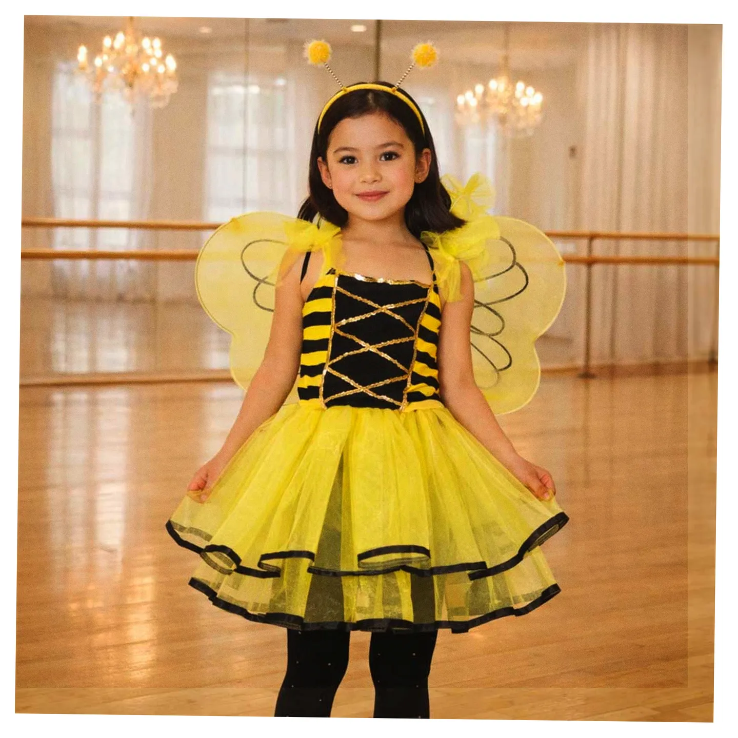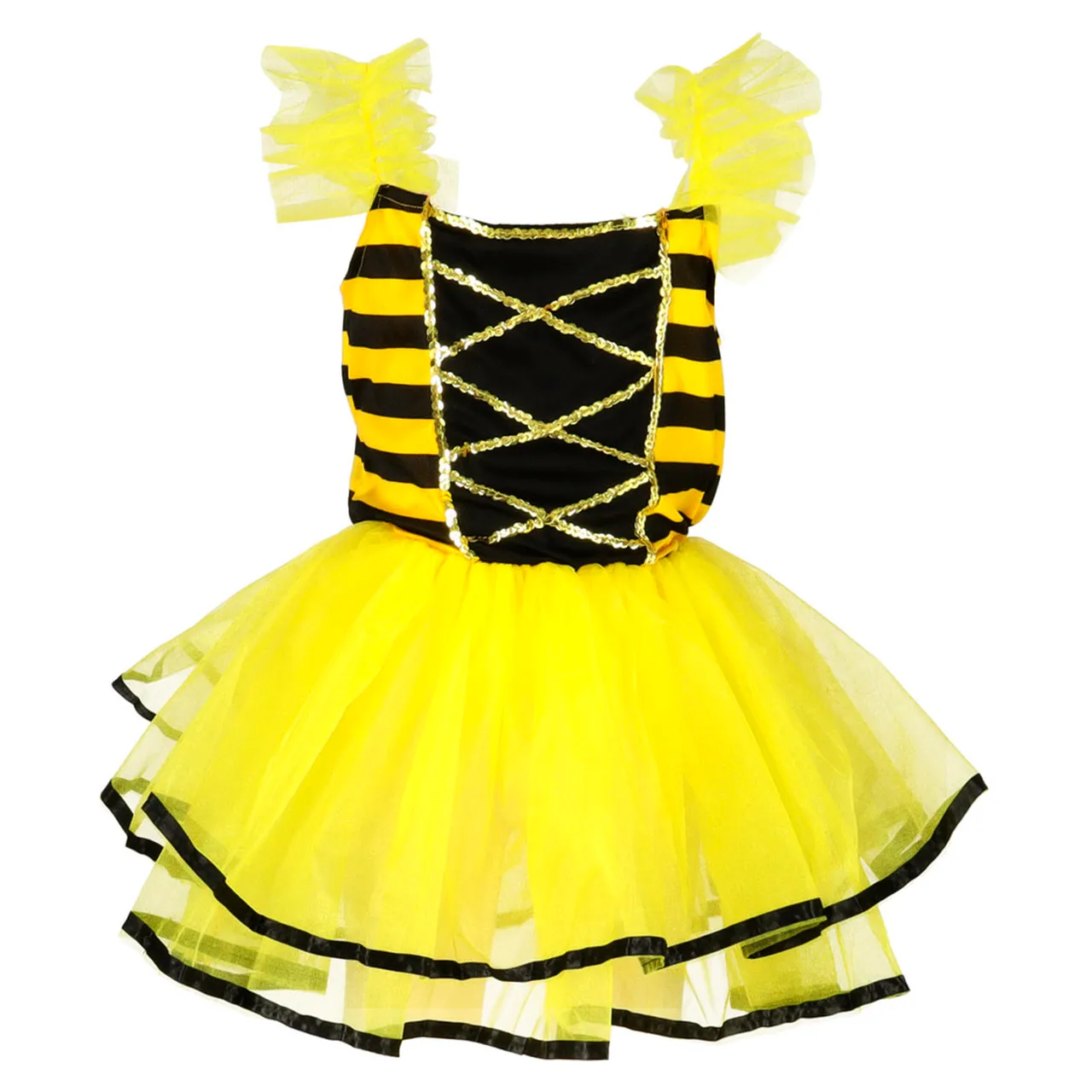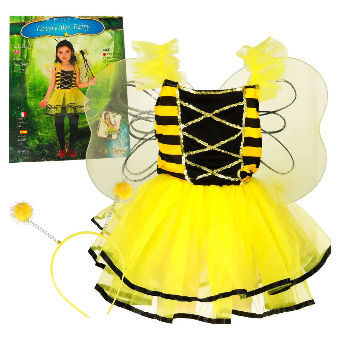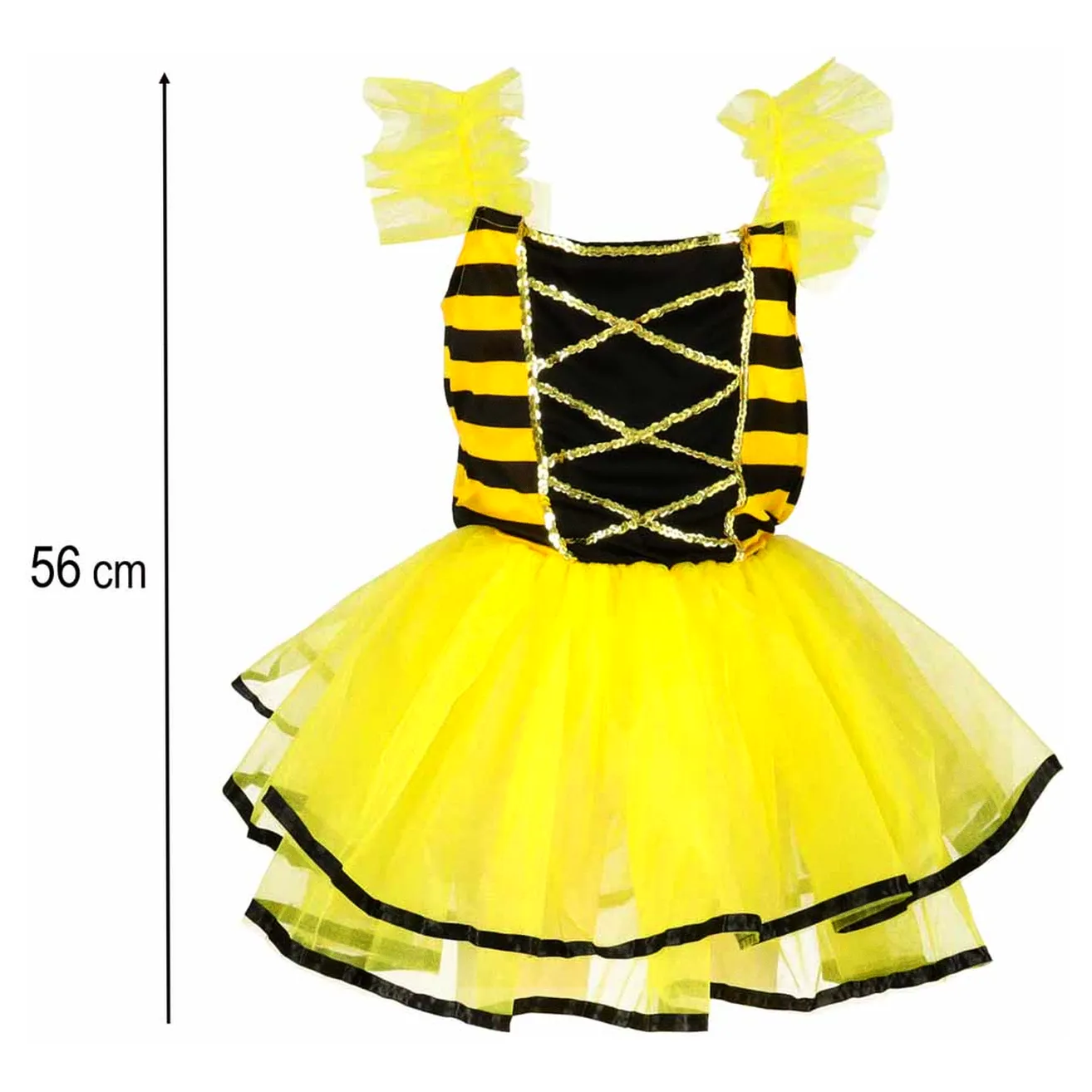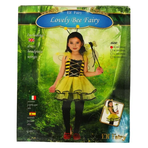Zestaw strój pszczółki dla dziewczynki: spódniczka z elastycznym pasem, lekkie skrzydełka na gumkach i opaska z czułkami. Dopasowany do wzrostu 100-110 cm. Idealny na karnawał i szkolne wydarzenia.