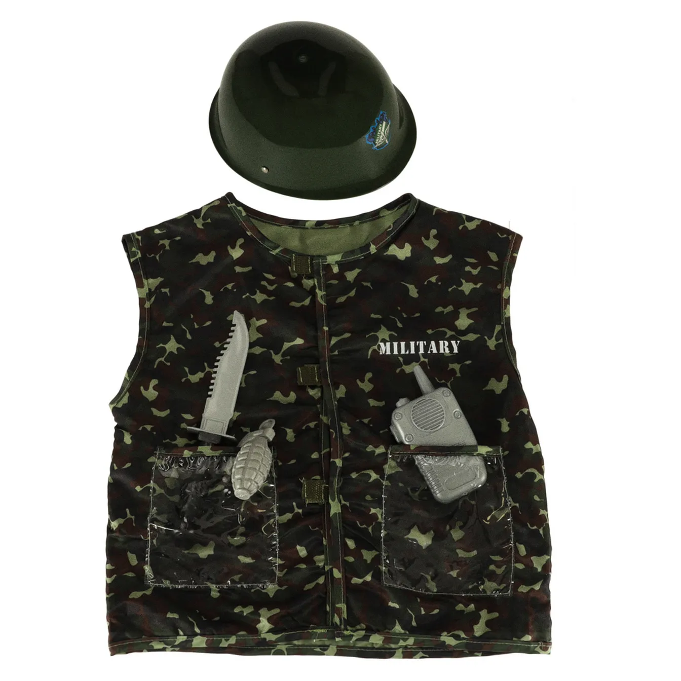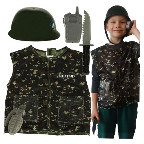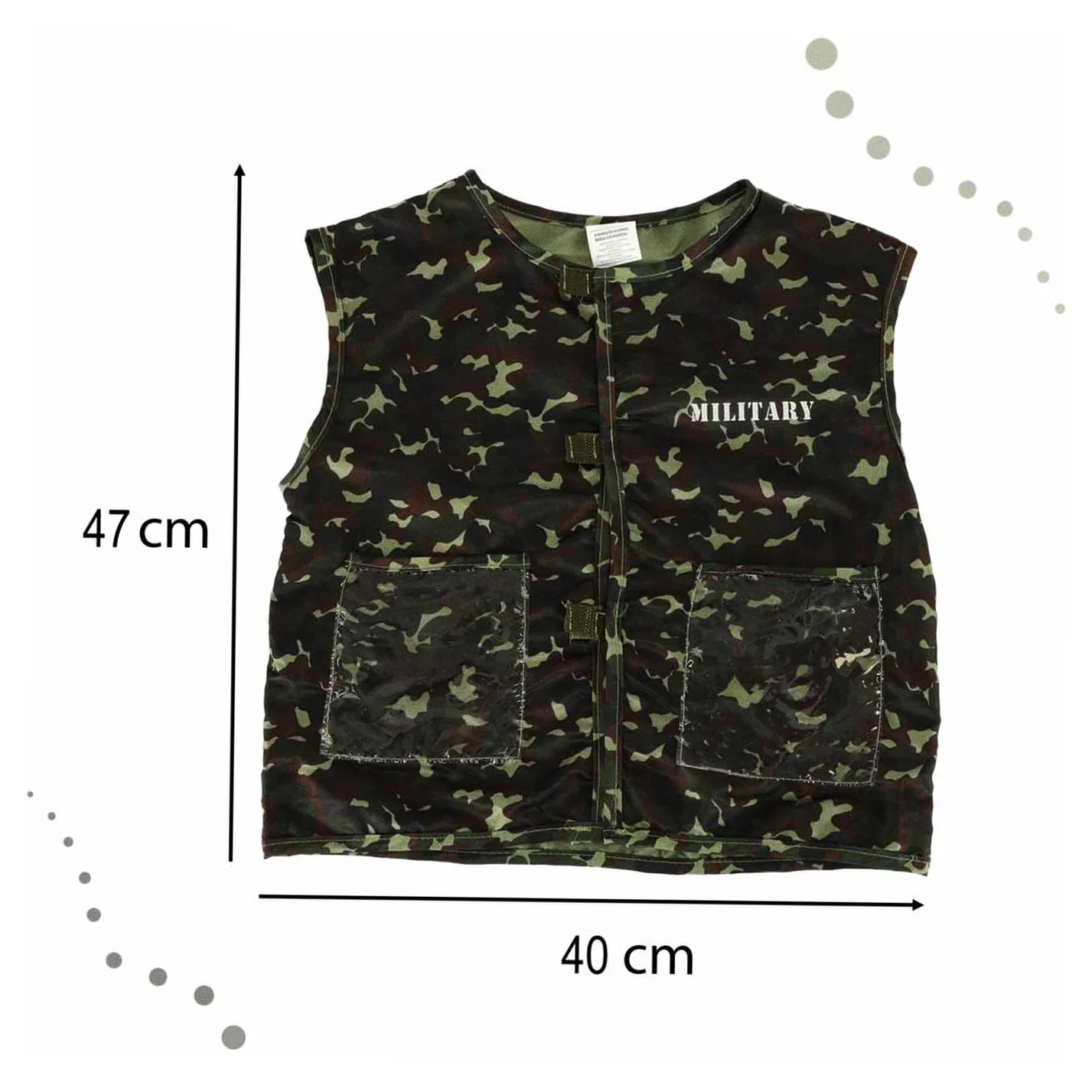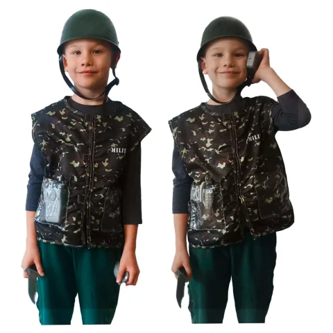 Zestaw kostium żołnierza dla dzieci z akcesoriami. Na karnawał i imprezy tematyczne. W komplecie kamizelka moro, hełm oraz akcesoria. Strój zaprojektowany dla dzieci w wieku 3–8 lat, zapewnia swobodę ruchów i wygodne użytkowanie podczas zabawy.