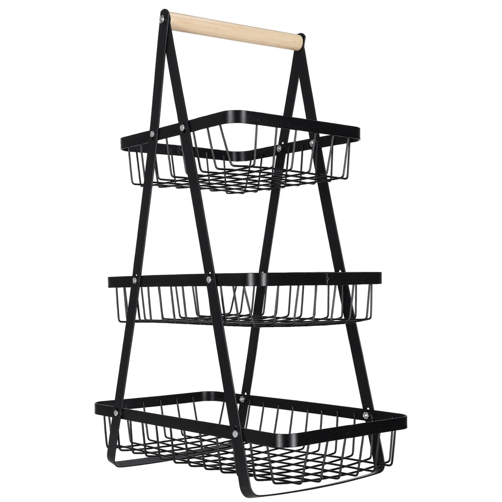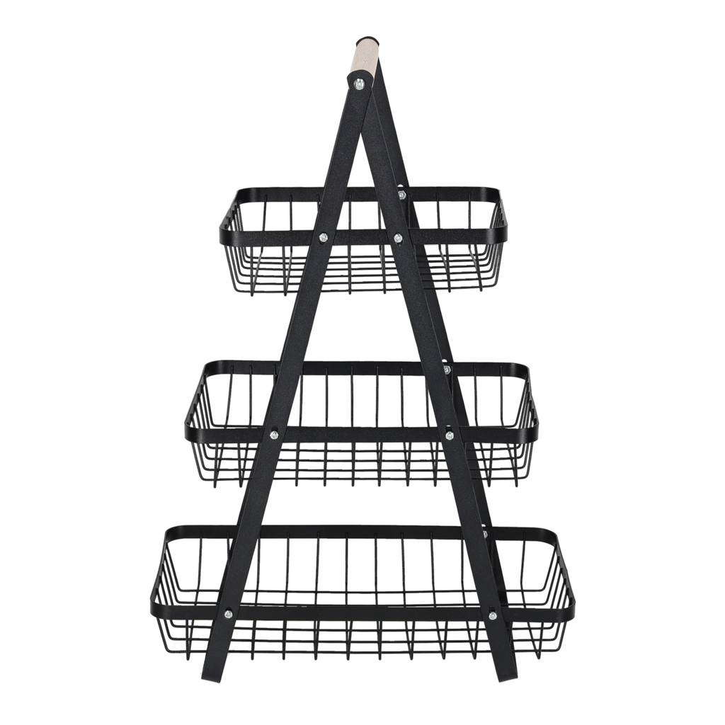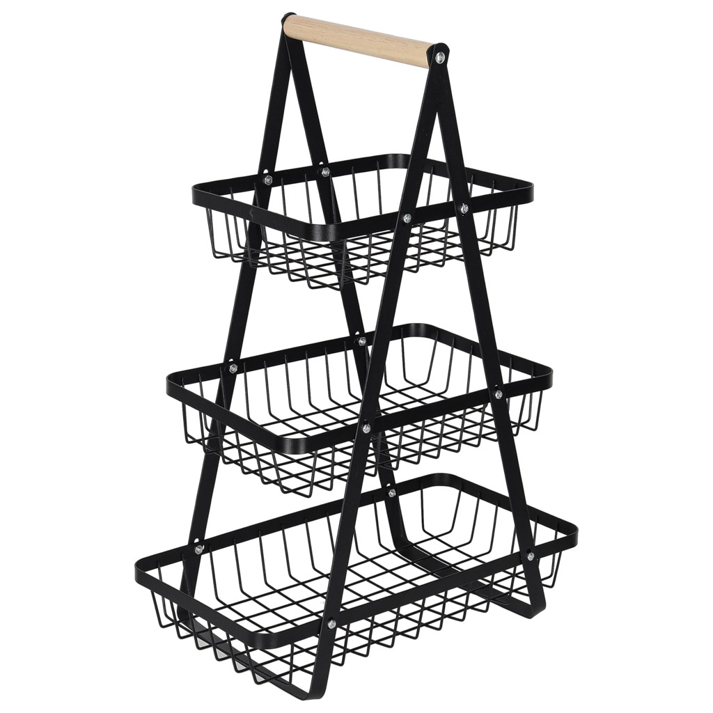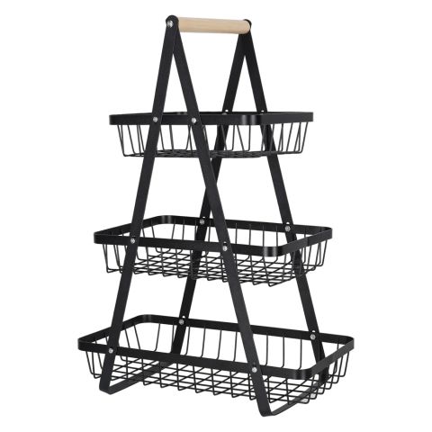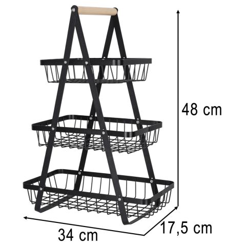 Kosz na owoce czarny trzypoziomowy piętrowy metal drewno