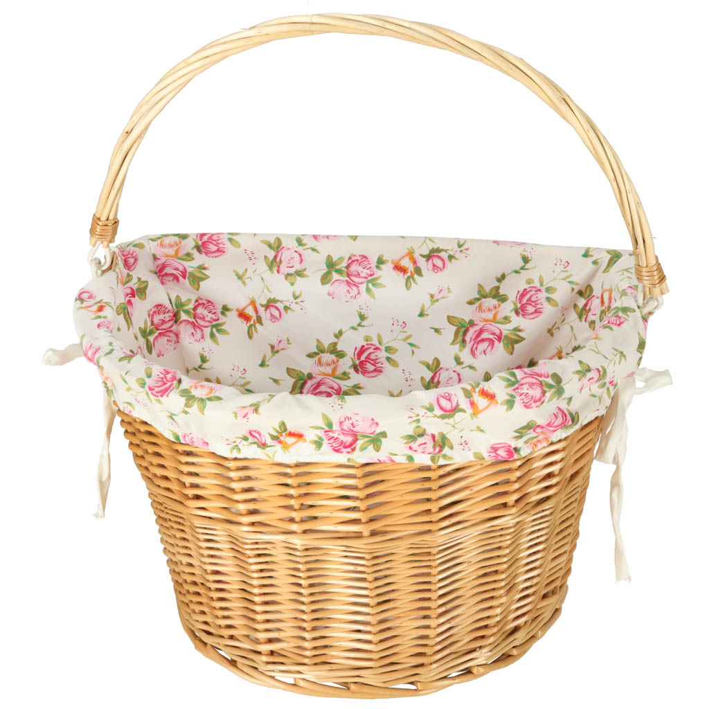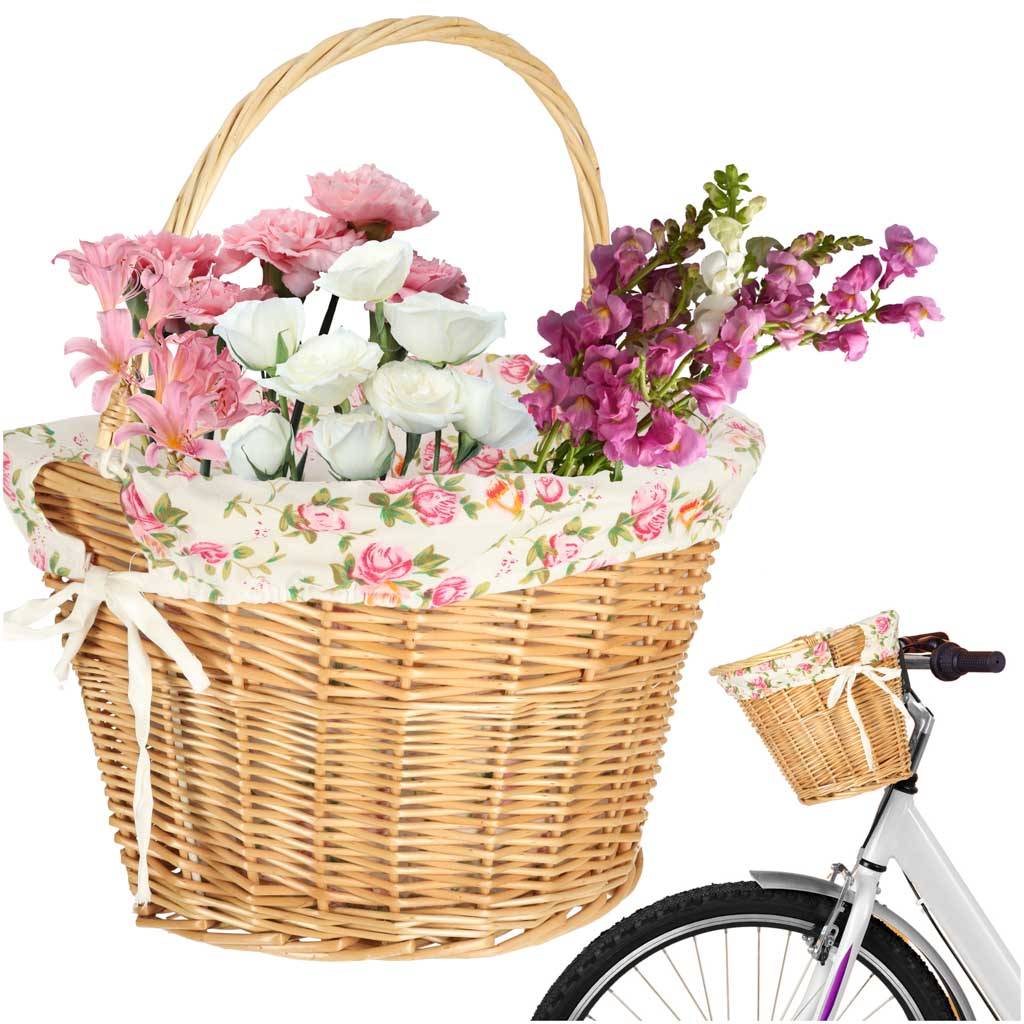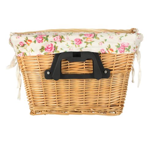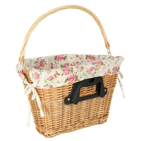 Wiklinowy kosz rowerowy z materiałowym wkładem w kwiaty. Posiada rączkę do łatwego przenoszenia. Mocowanie typu „click” ułatwia odpinanie i przypinanie koszyka. W zestawie elementy do montażu. Tworzywo: wiklina, poliester. Wymiary: 26 cm x 43 cm x 23 cm.