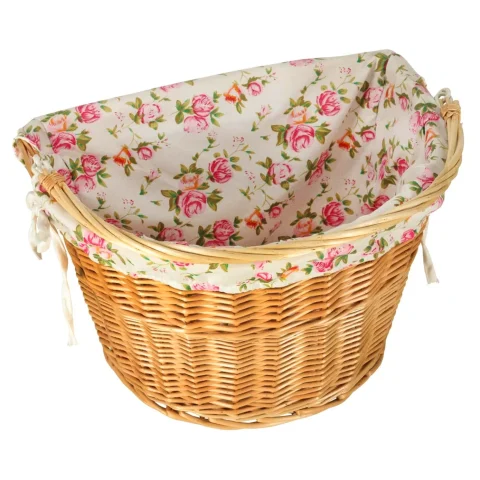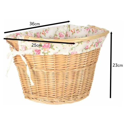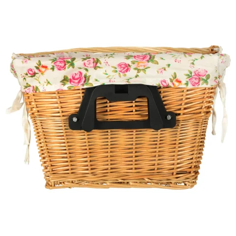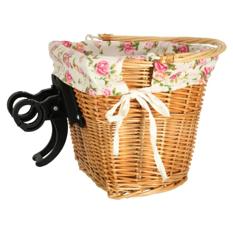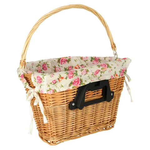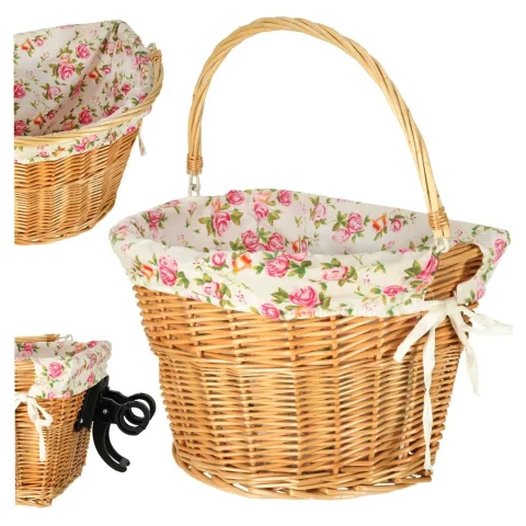 Wiklinowy kosz rowerowy z materiałowym wkładem w kwiaty. Posiada rączkę do łatwego przenoszenia. Mocowanie typu „click” ułatwia odpinanie i przypinanie koszyka. W zestawie elementy do montażu. Tworzywo: wiklina, poliester. Wymiary: 36 x 25 x 23 cm.
