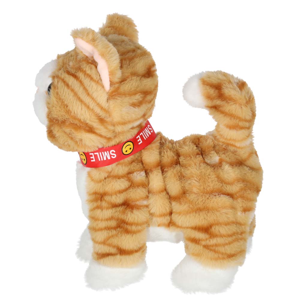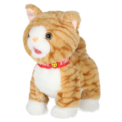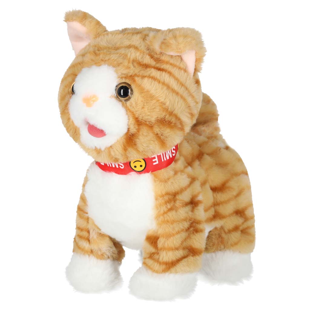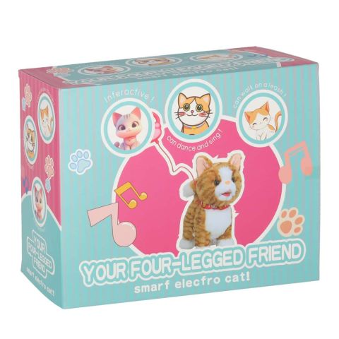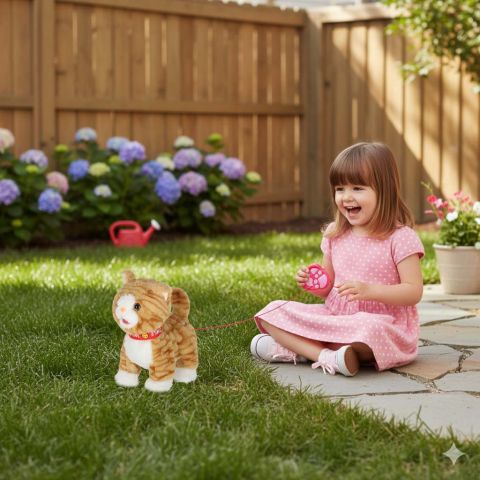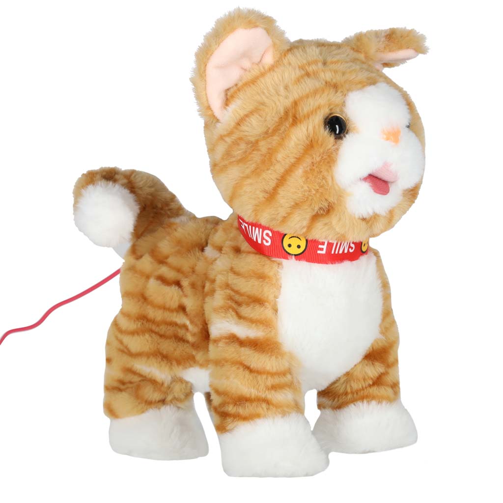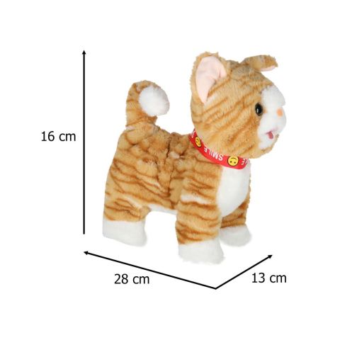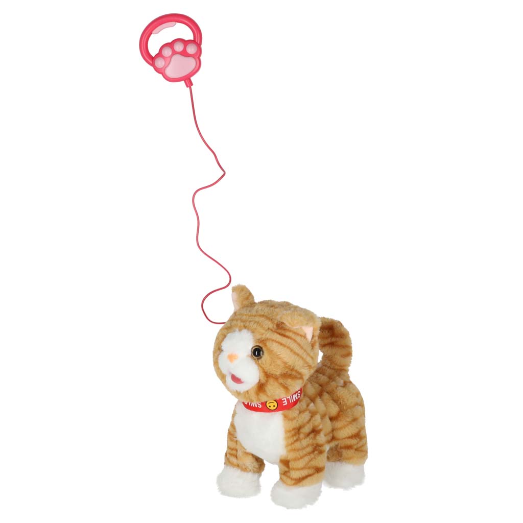 Beżowy interaktywny kotek STEM na smyczy. Naciśnij przycisk na uchwycie, by kotek zaczął iść do przodu i śpiewać piosenki. Kotek reaguje również na głaskanie po głowie – miauczy, porusza głową i ogonem oraz wystawia język. Wymiary: 16 x 13 x 28 cm