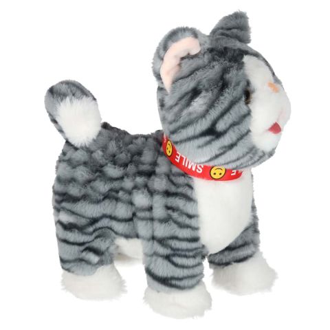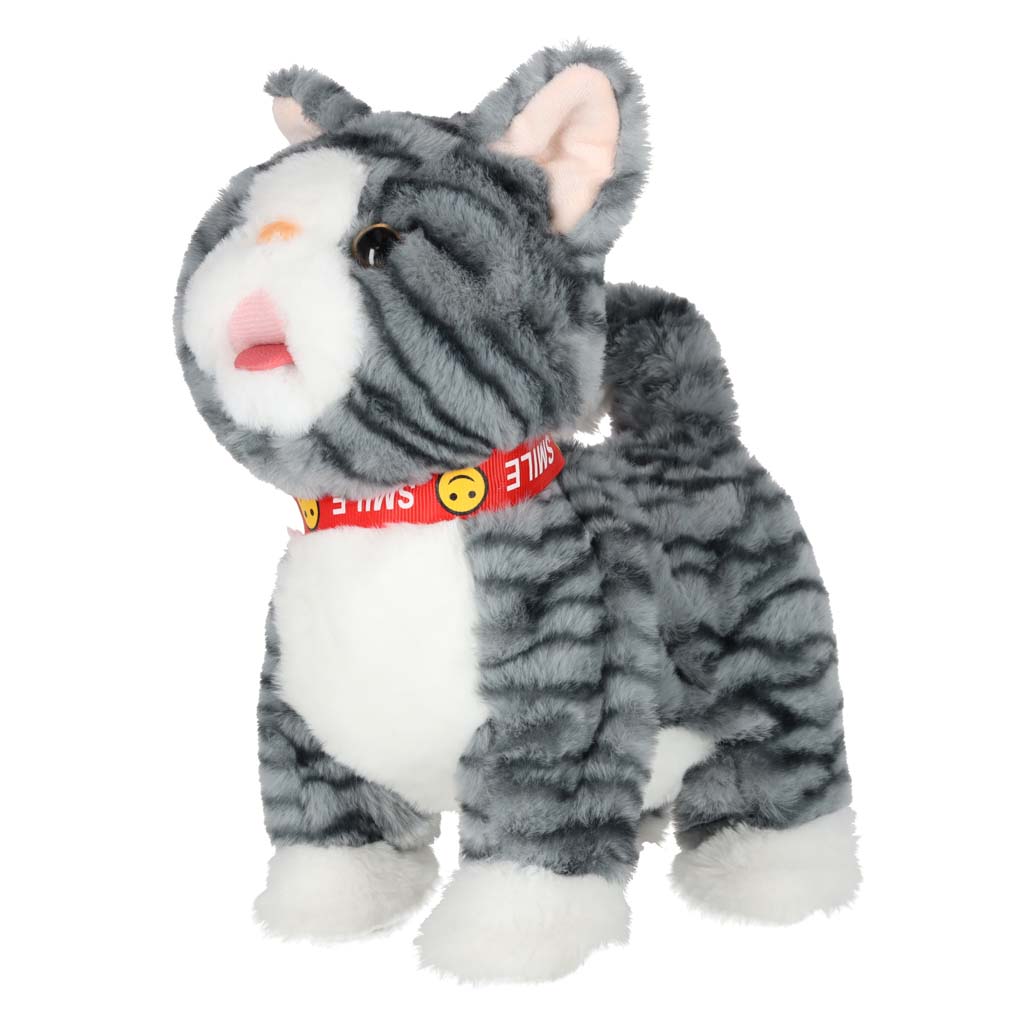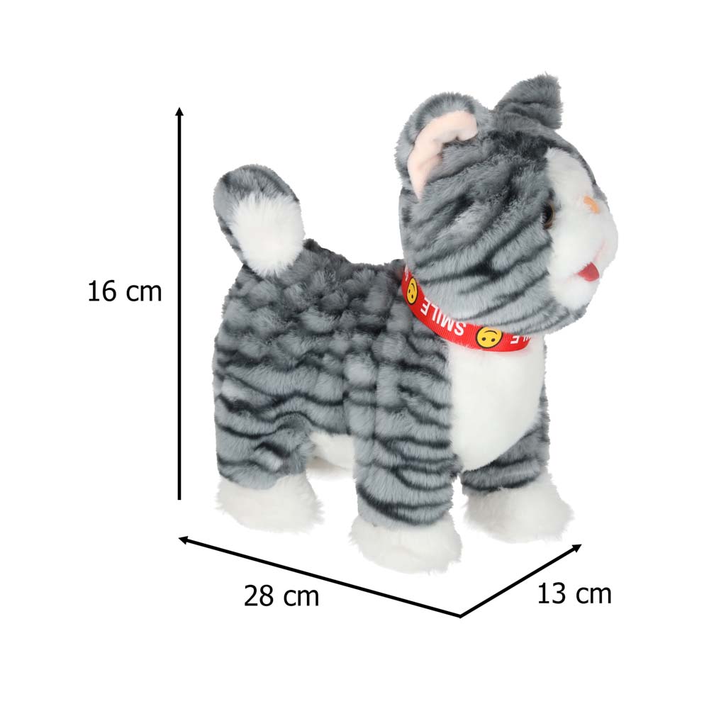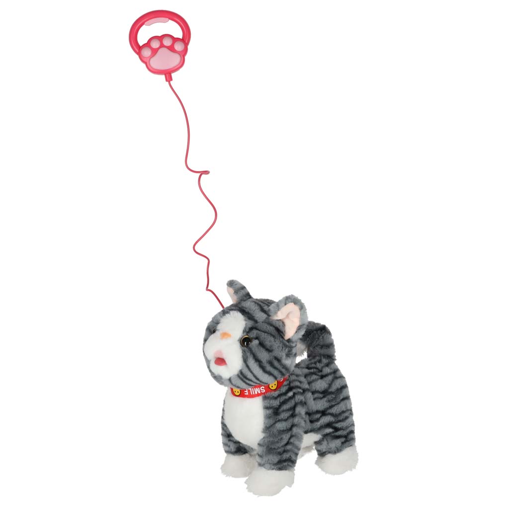 Szary kotek na smyczy STEM, który jednocześnie chodzi i odtwarza piosenki w języku angielskim. Po pogłaskaniu kotek miauczy, macha ogonkiem i porusza językiem. Pluszowa zabawka na baterie AA da dzieci od 3 lat. Wymiary: 16 x 13 x 28 cm
