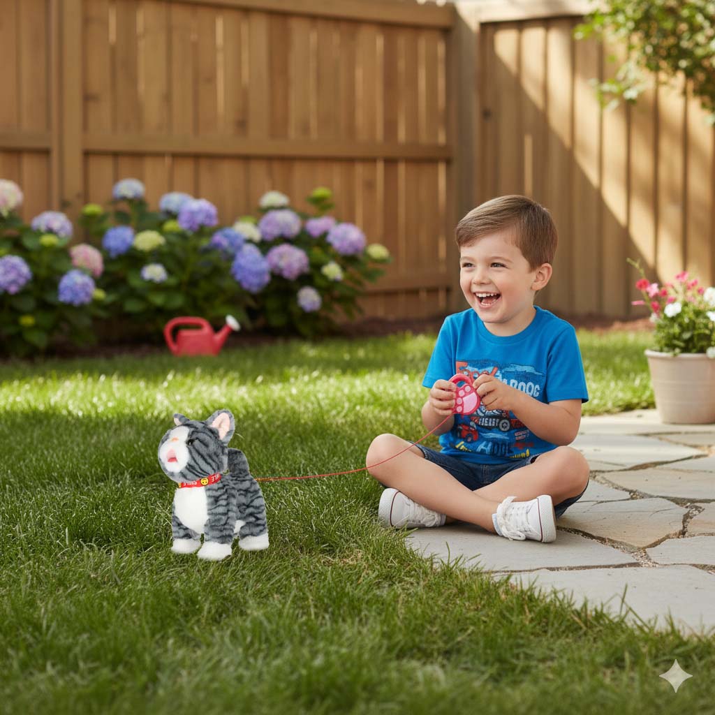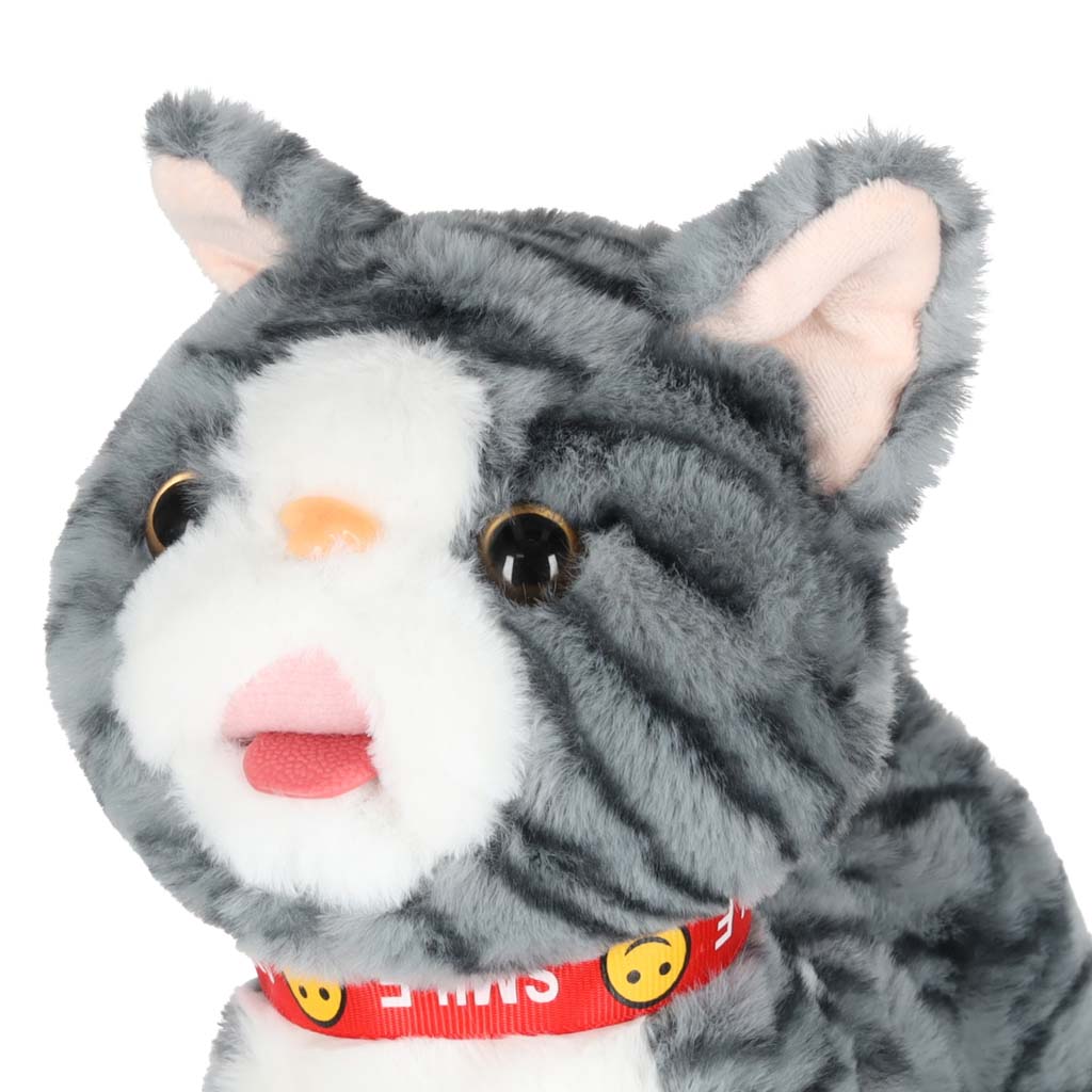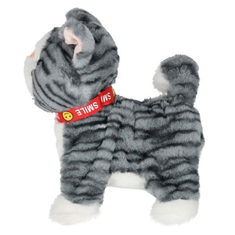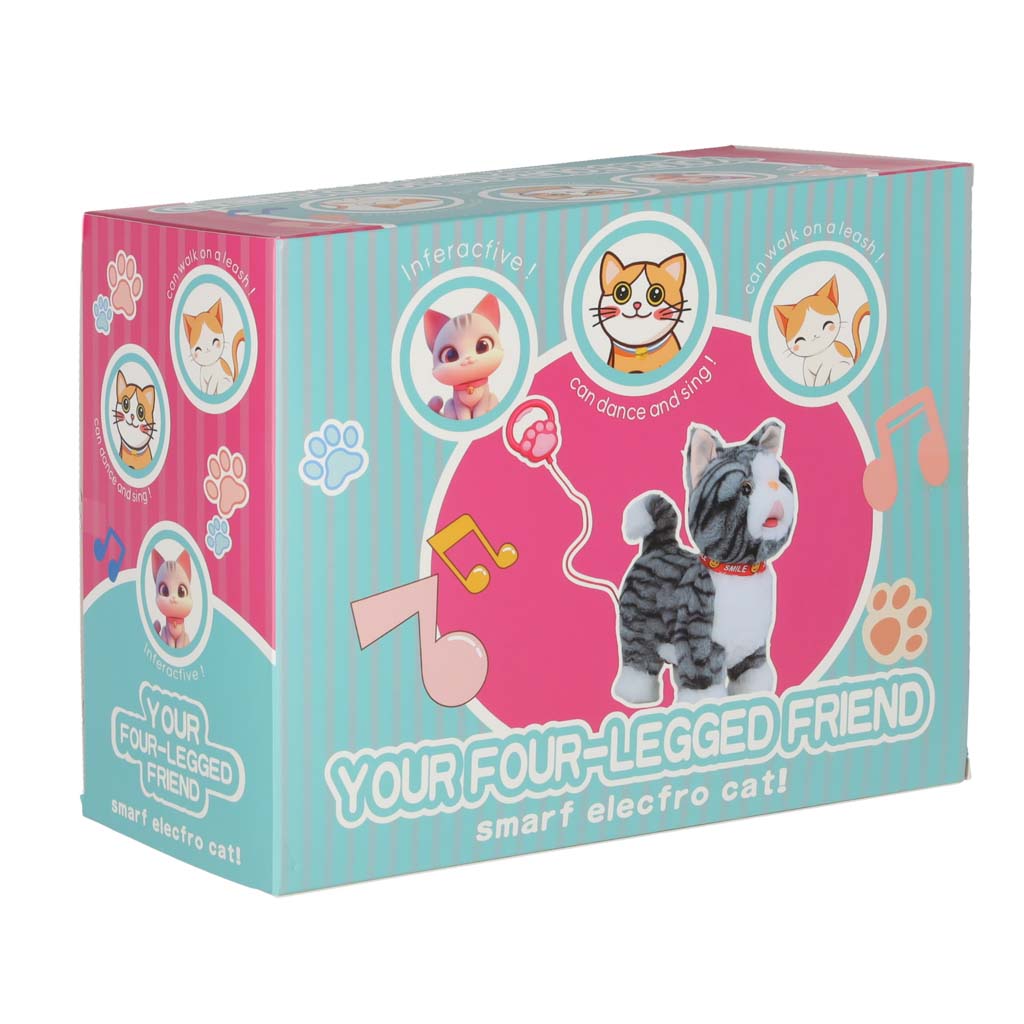 Szary kotek na smyczy STEM, który jednocześnie chodzi i odtwarza piosenki w języku angielskim. Po pogłaskaniu kotek miauczy, macha ogonkiem i porusza językiem. Pluszowa zabawka na baterie AA da dzieci od 3 lat. Wymiary: 16 x 13 x 28 cm