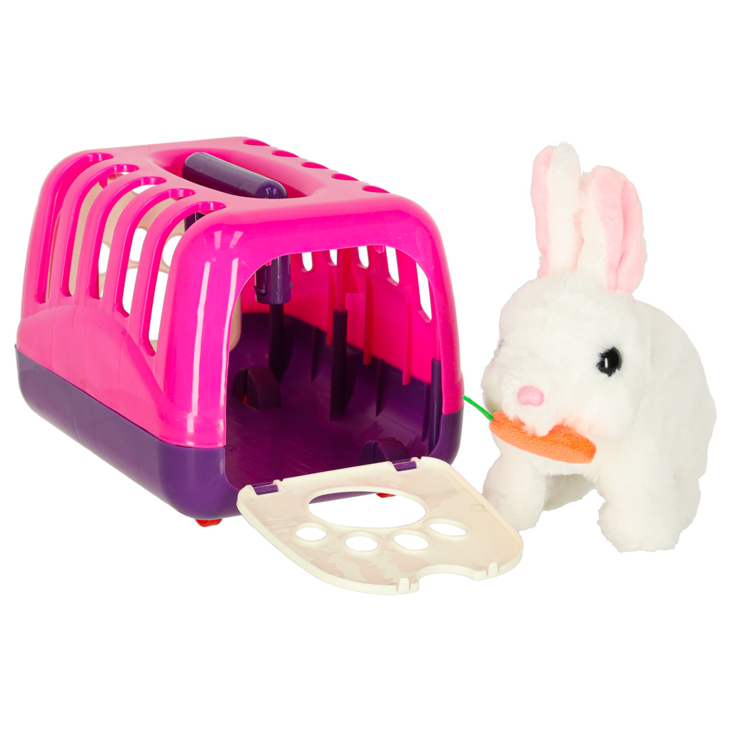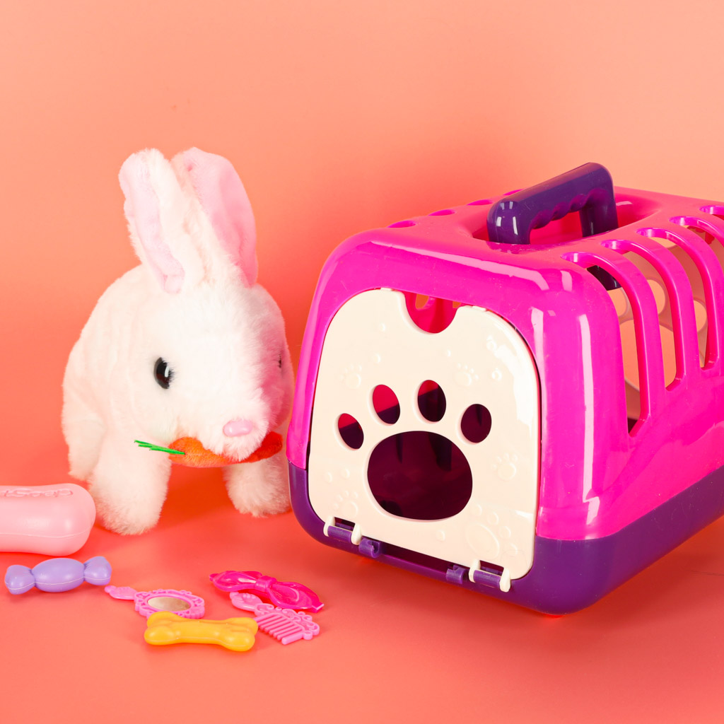 Interaktywny króliczek posiada wysokiej jakości wykonanie z bezpiecznych materiałów: miękkiego poliestru i trwałego tworzywa sztucznego. Działa na 2 baterie AA (brak w zestawie). Transporter opakowany jest jest w estetyczną kolorową etykietę – idealne na prezent.