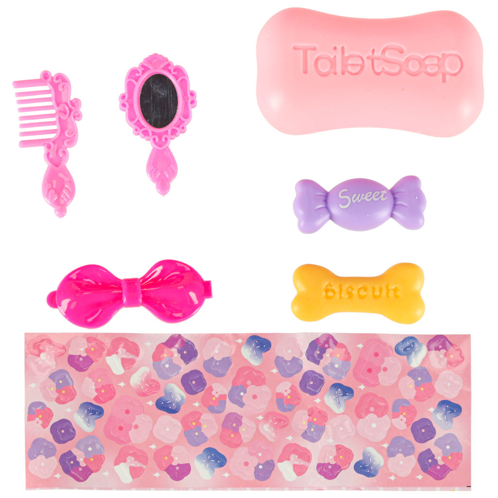 • Zabawowe akcesoria – mydełko, grzebyk, lusterko, spinka, ciastko i cukierek