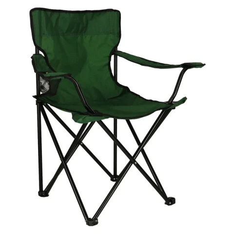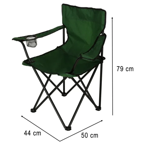 Składane krzesło turystyczne, kolor czarno-zielony. Wymiary po rozłożeniu: 44×50×79cm, po złożeniu: 17×13×80cm. Siedzisko z tkaniny Oxford 600D z powłoką hydrofobową. Stelaż: stal węglowa 16mm×0,5mm. Udźwig: 95kg. W komplecie torba transportowa.