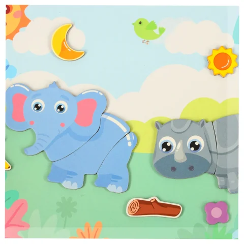 Magnetyczne puzzle przedstawiają wiele występujących na safari i nie tylko zwierząt! Wśród nich znajduje się majestatyczny lew, potężny słoń, zwinna zebra, a także goryl, hipopotam, flaming, panda i inne! Oprócz zwierząt wśród puzzli znajdują się różne dodatki, takie jak gałęzie i różne jedzenie!