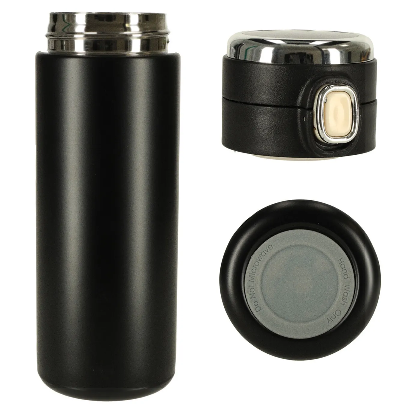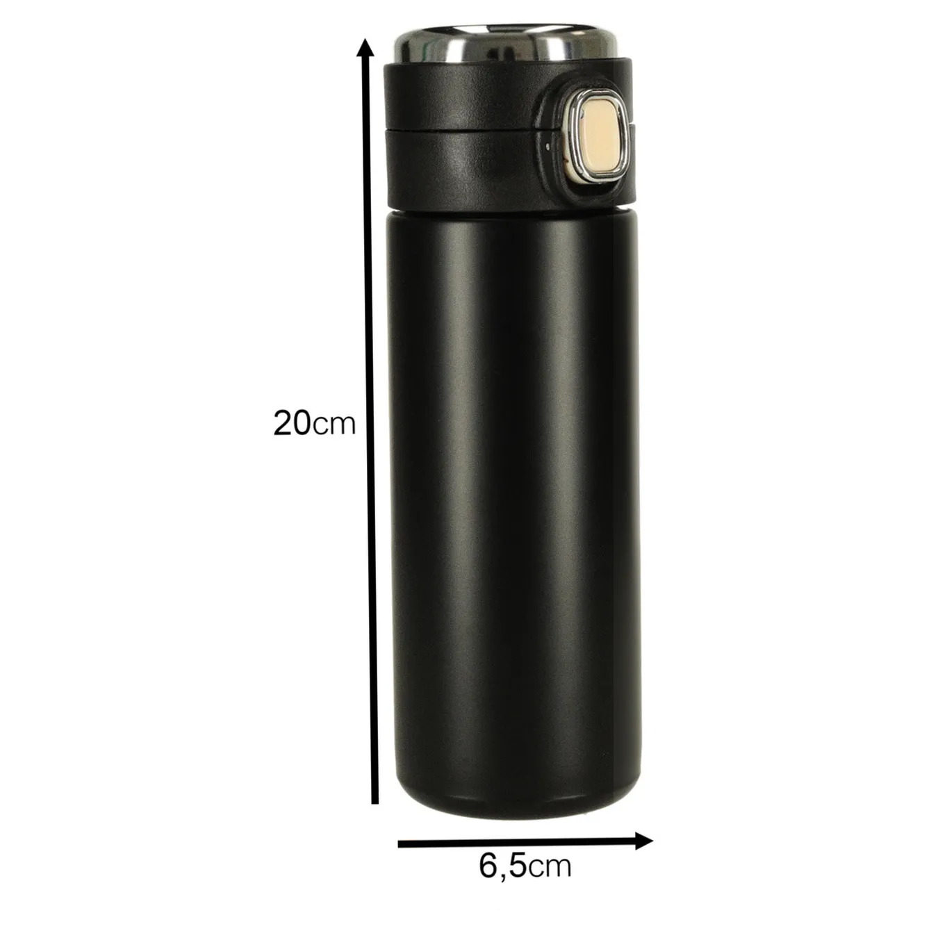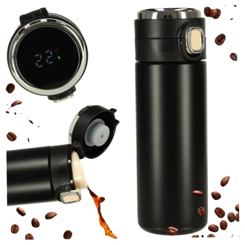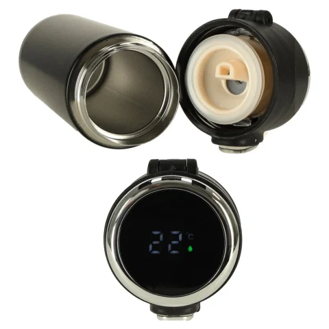 Kubek termiczny z wyświetlaczem LED pokazującym temperaturę. Utrzymuje temperaturę napoju do kilku godzin. Otwiera się poprzez przycisk. Posiada niewymienną baterię Pojemność: 350 ml. Kolor: czarny. Wymiary: 20 cm x 6,5cm.
