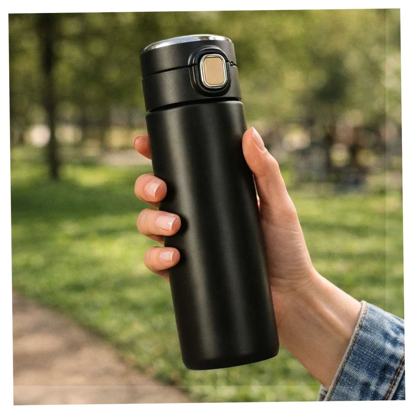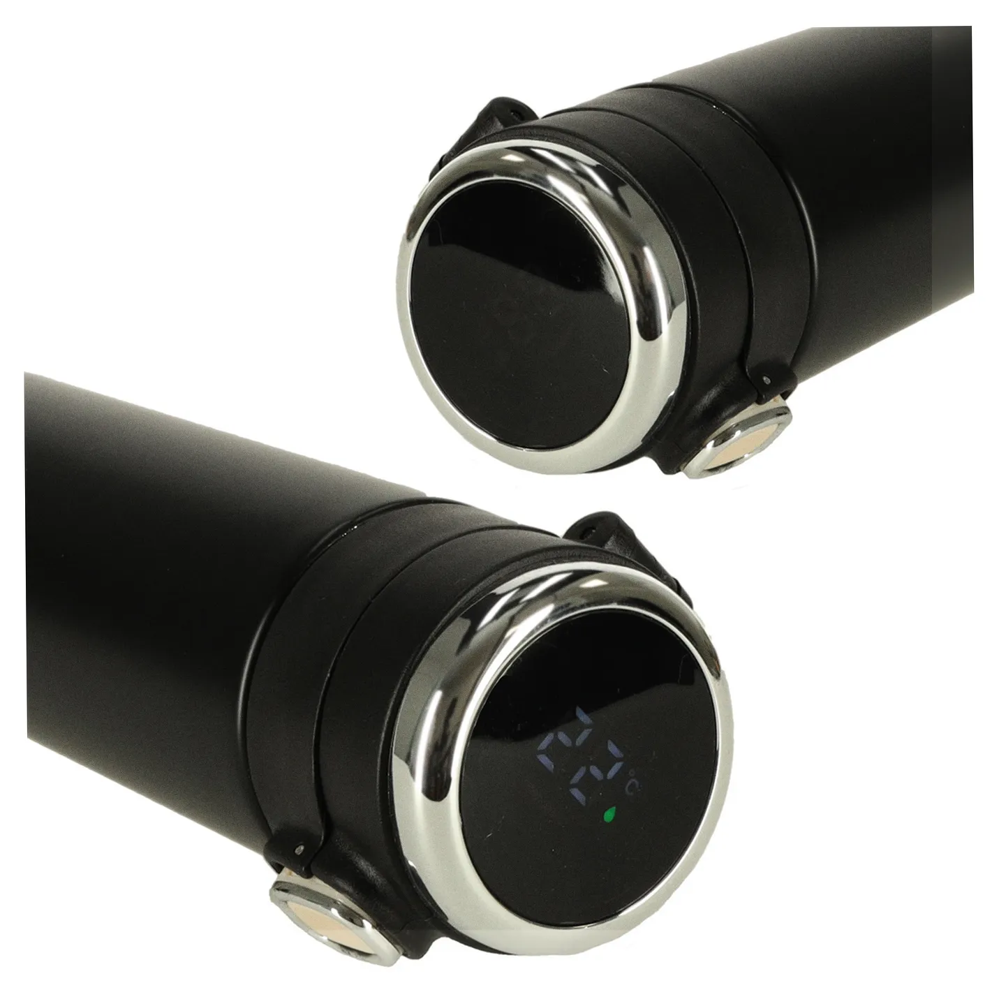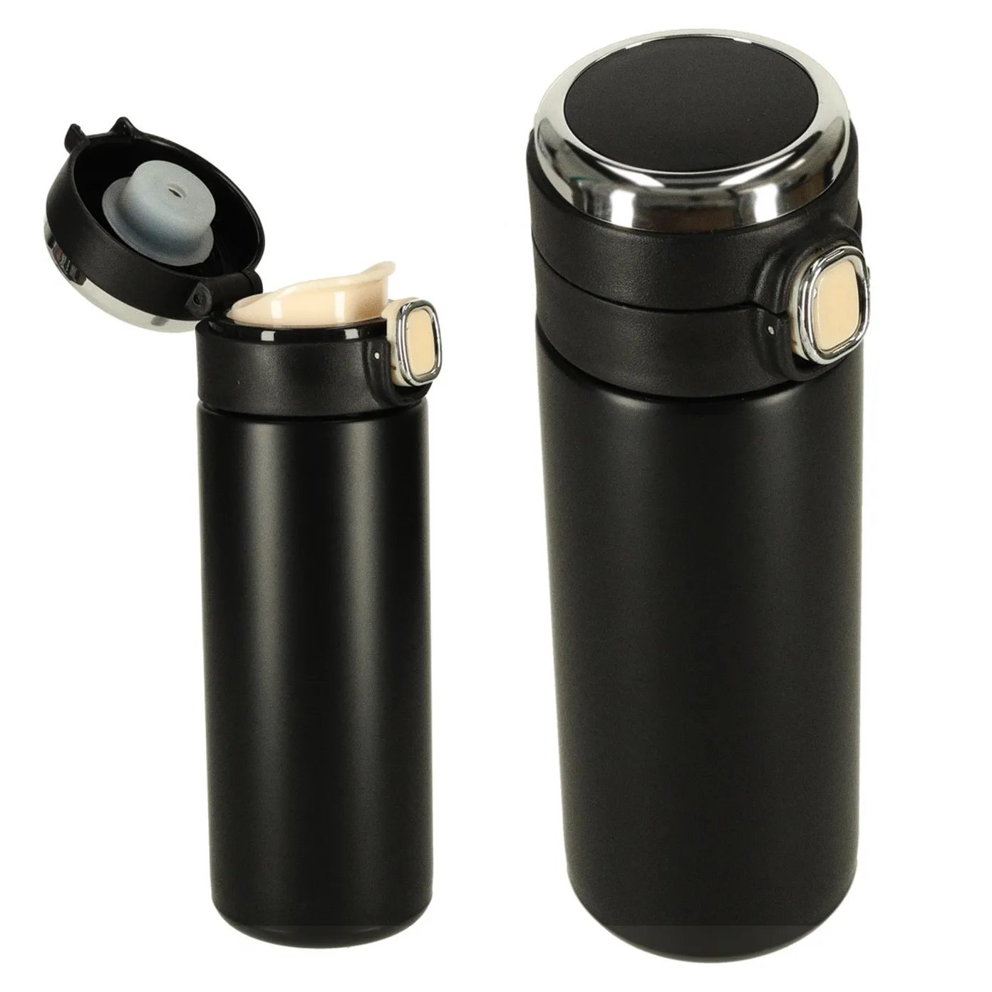 Kubek termiczny z wyświetlaczem LED pokazującym temperaturę. Utrzymuje temperaturę napoju do kilku godzin. Otwiera się poprzez przycisk. Posiada niewymienną baterię Pojemność: 350 ml. Kolor: czarny. Wymiary: 20 cm x 6,5cm.