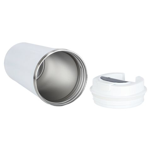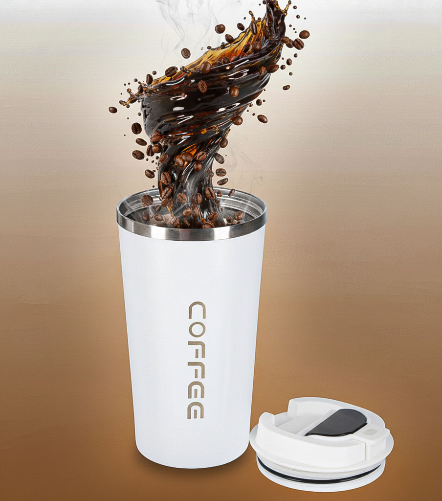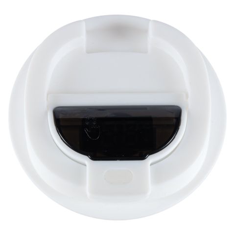 Smart kubek podróżny z czujnikiem temperatury i wyświetlaczem LED. Ścianki ze stali nierdzewnej, pojemność 500 ml, zakręcane wieczko. Informuje zmianą koloru kropelki o gotowości napoju do picia.