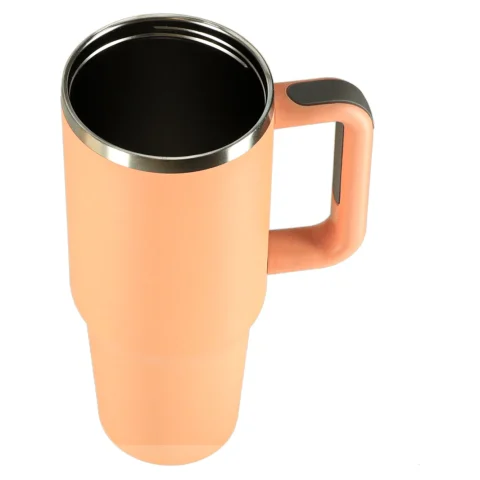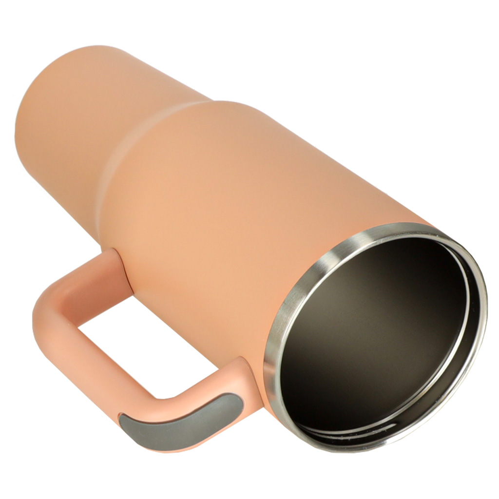 Duży kubek termiczny z uchwytem 1,2 l w kolorze pudrowego różu. Wykonany ze stali nierdzewnej i tworzywa sztucznego, z izolacją z podwójną ścianką. Kubek termiczny z uchwytem stalowym i słomką, idealny do gorących i zimnych napojów.