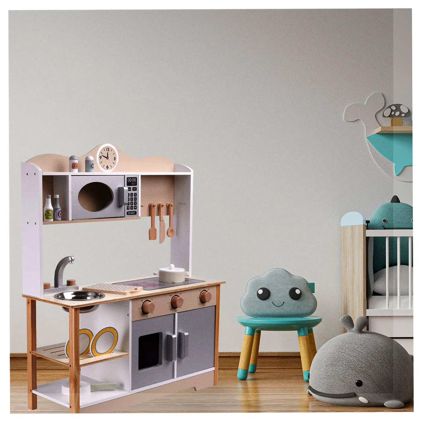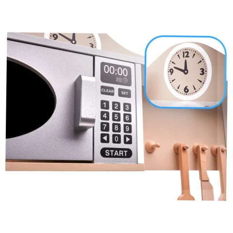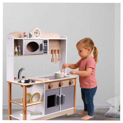 Posiada wiele funkcji prawdziwej kuchni, wyposażona została w zlew, kran, kuchenkę, mikrofalówkę, a także półeczki i szafeczki! Dzięki temu odnalezienie się w przyszłości w prawdziwej kuchni będzie dużo łatwiejsze i przyjemniejsze.