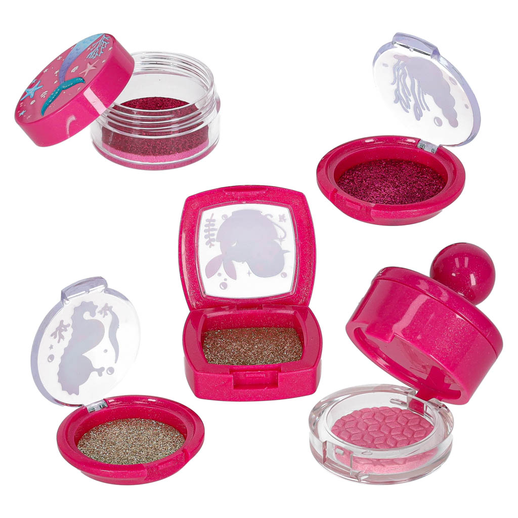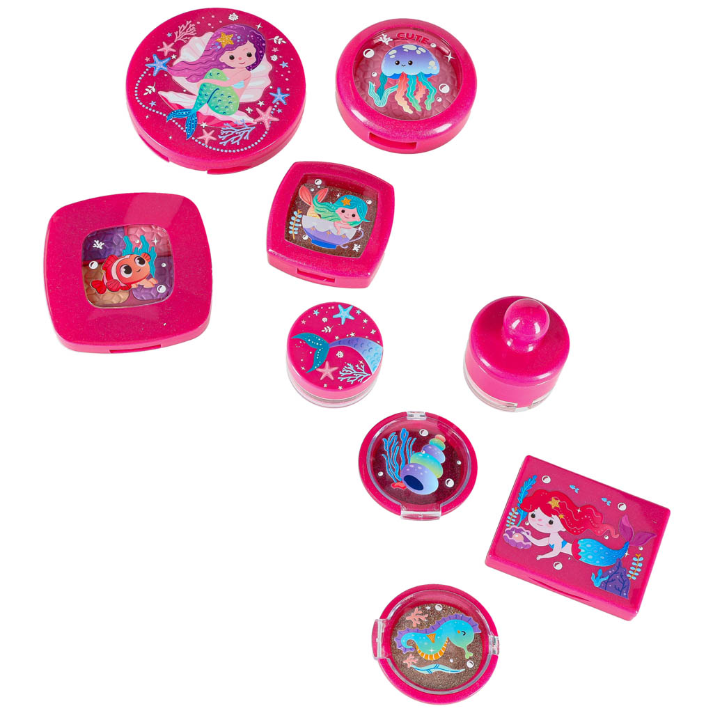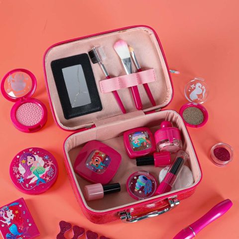 Kuferek z kosmetykami dla dziewczynki z motywem syrenek i zwierzątek morskich. Zawiera bezpieczne atrapy kosmetyków, lusterko i akcesoria do stylizacji. Wykonany z trwałego tworzywa, lekki, poręczny i idealny do zabawy w makijaż dla dzieci od 3 roku życia
