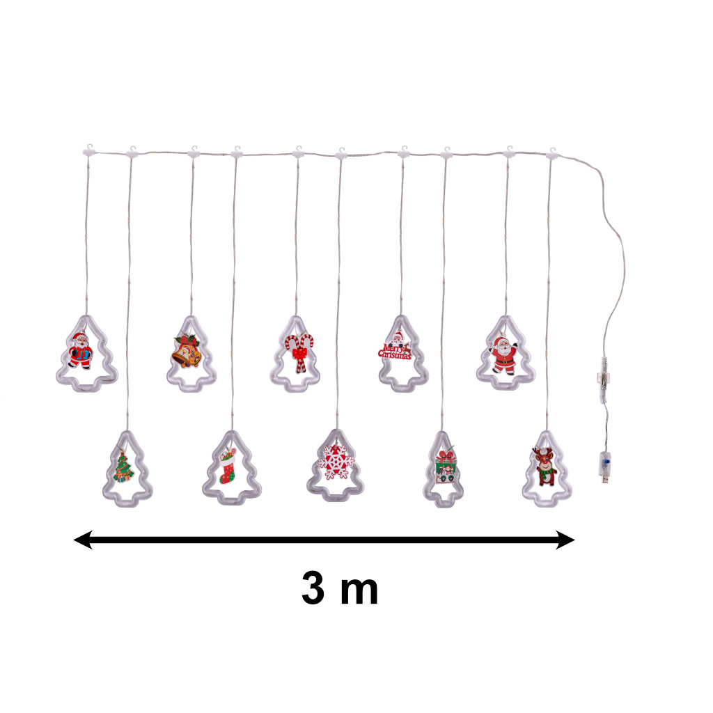 Fantastyczna kurtyna świetlna z świątecznymi figurkami, które nadadzą bożonarodzeniowego klimatu każdemu wnętrzu! Posiada 8 trybów świecenia. Pilot w zestawie. Zasilanie: port USB. Kolor lampek: ciepły biały. Dł. łańcucha: 3m. Dł. dłuższego sopla: 30cm.