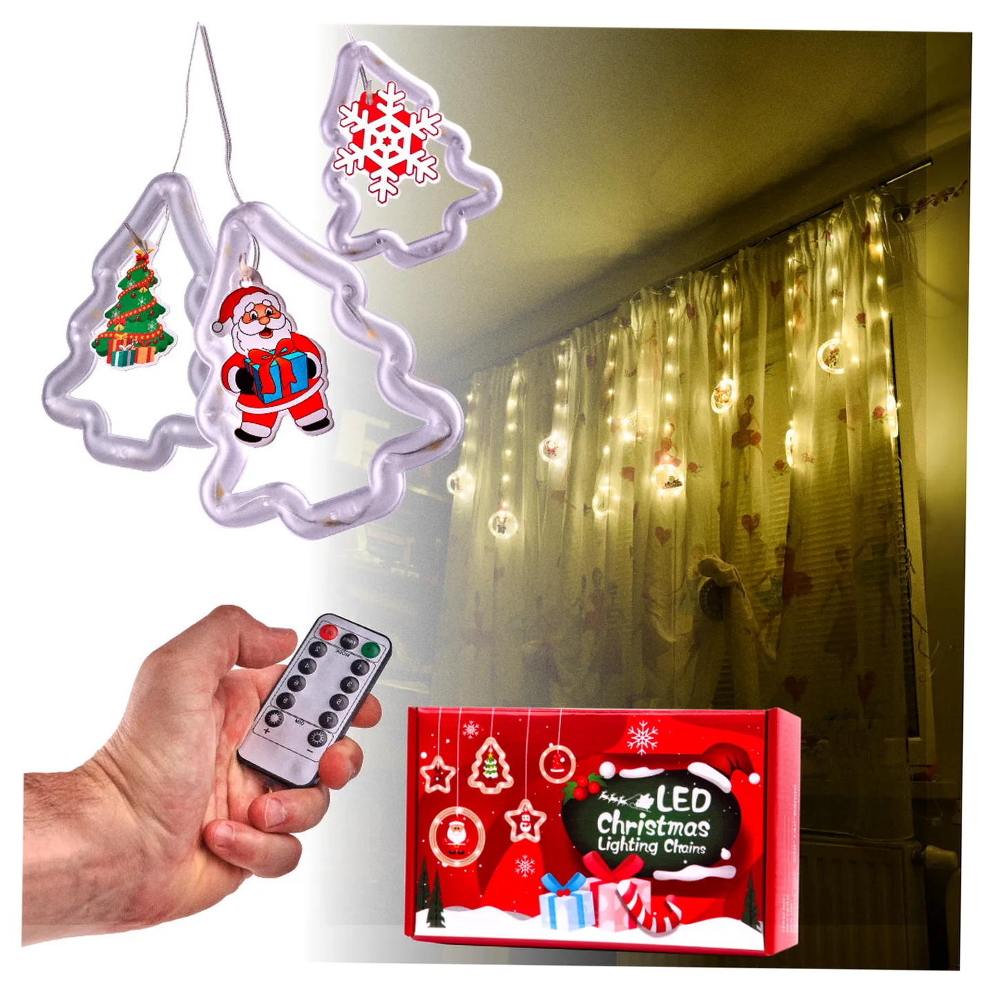 Kurtyna świetlna z kolorowymi figurkami świątecznymi stworzy przytulną atmosferę w Twoim domu podczas świąt Bożego Narodzenia! Łączna długość kurtyny to aż 3 metry. Jest zasilana poprzez port USB i posiada aż 8 różnych trybów świecenia. Kolorowe obrazki wprowadzą świąteczny klimat!