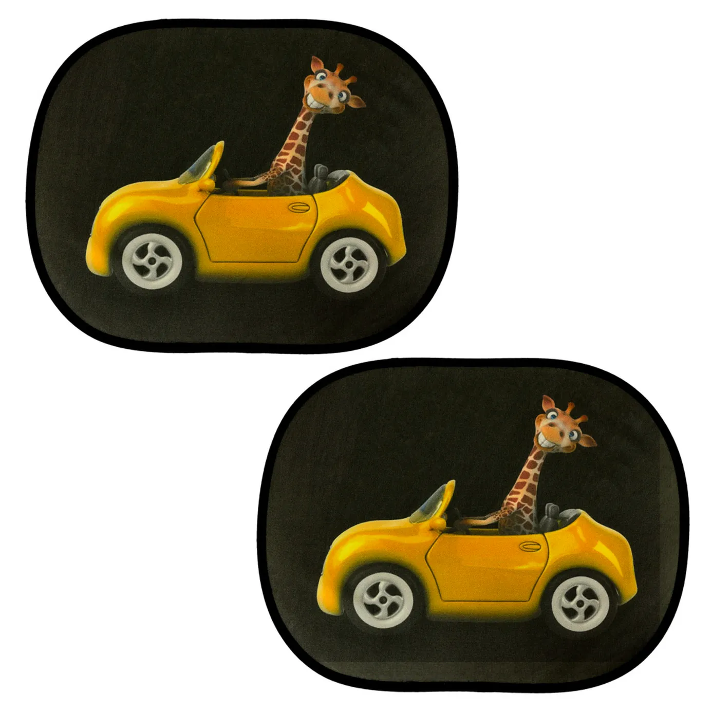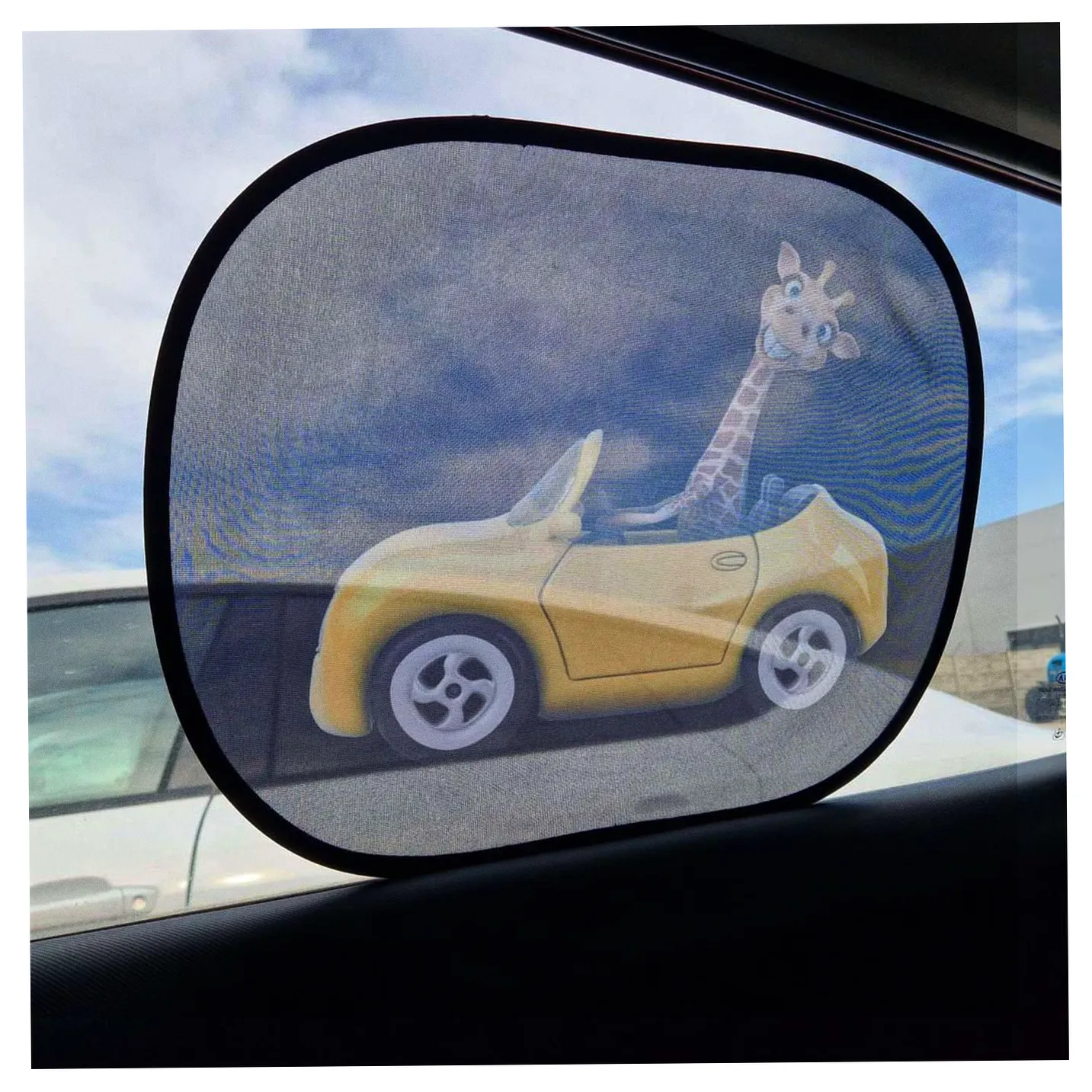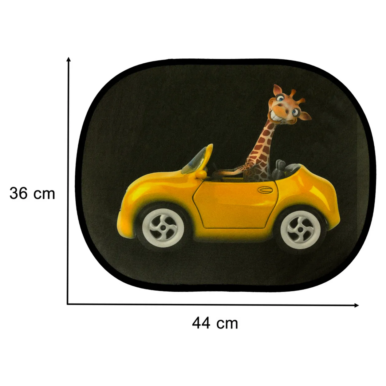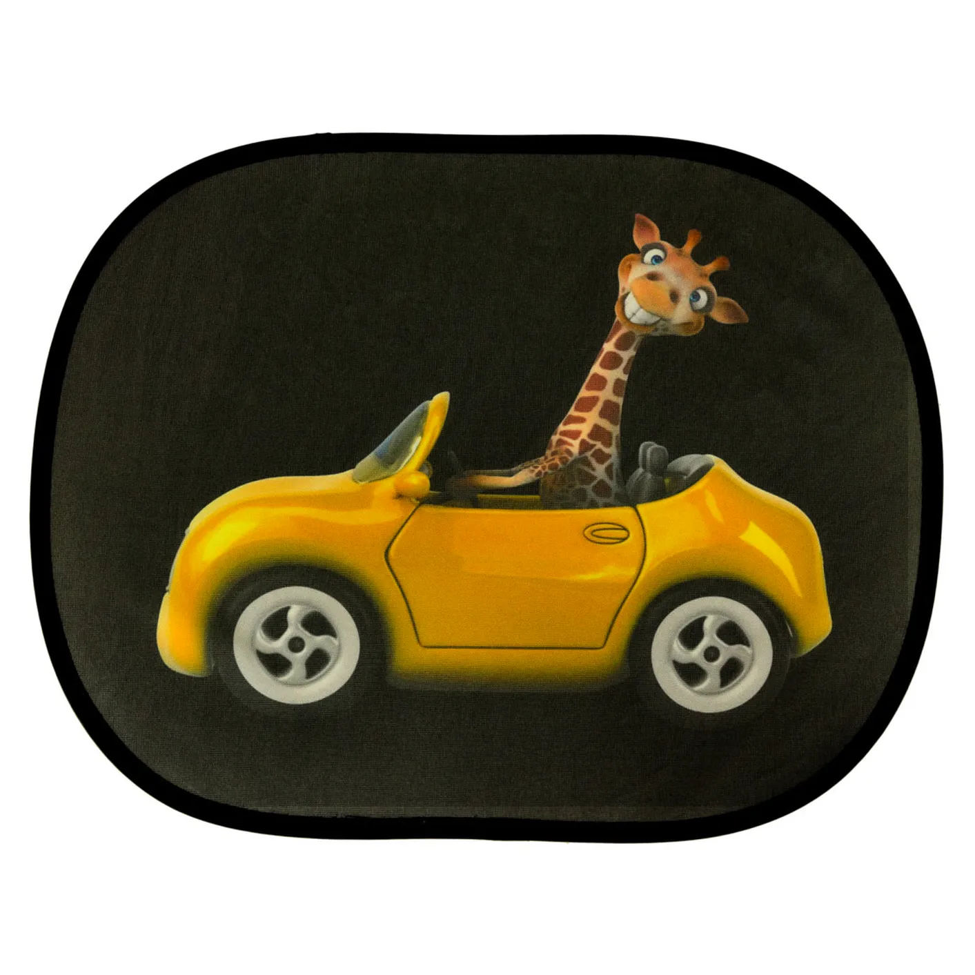 Praktyczny zestaw 2 kurtyn przeciwsłonecznych na okno samochodu z przyjazną żyrafkąi. Zestaw zapewnia bezpieczną i komfortową podróż. Blokuje promienie słońca i zapobiega nagrzaniu się samochodu. Łatwy i nieinwazyjny montaż. Wymiary: 44x36cm.