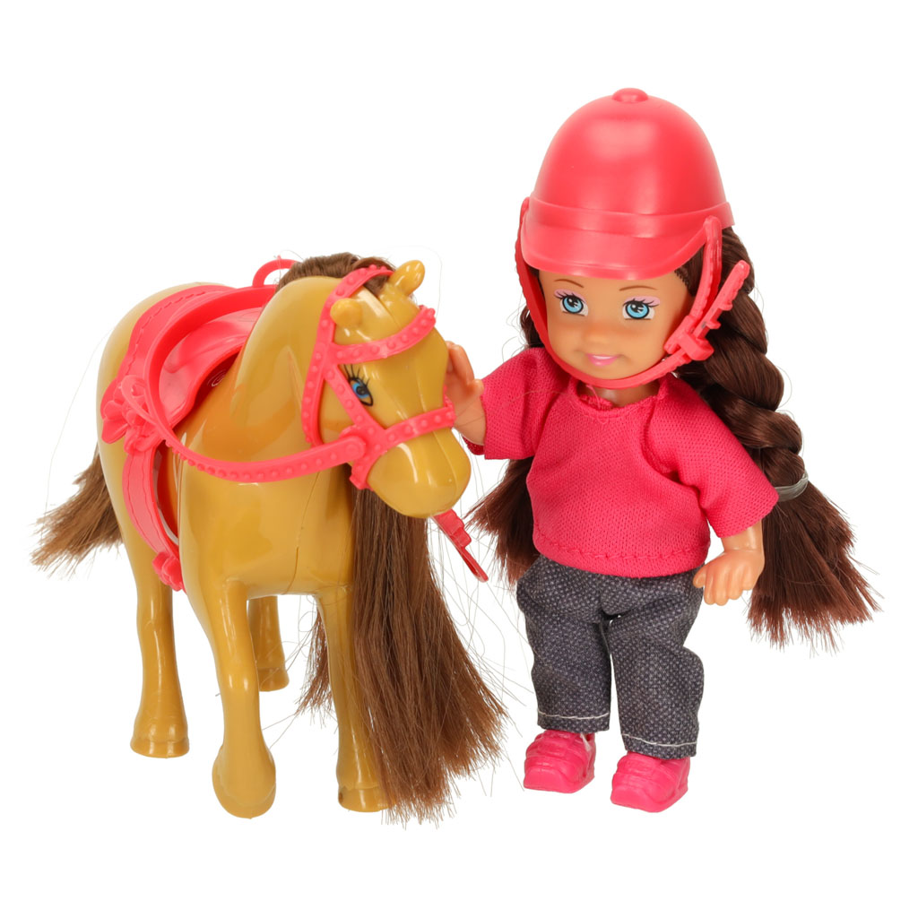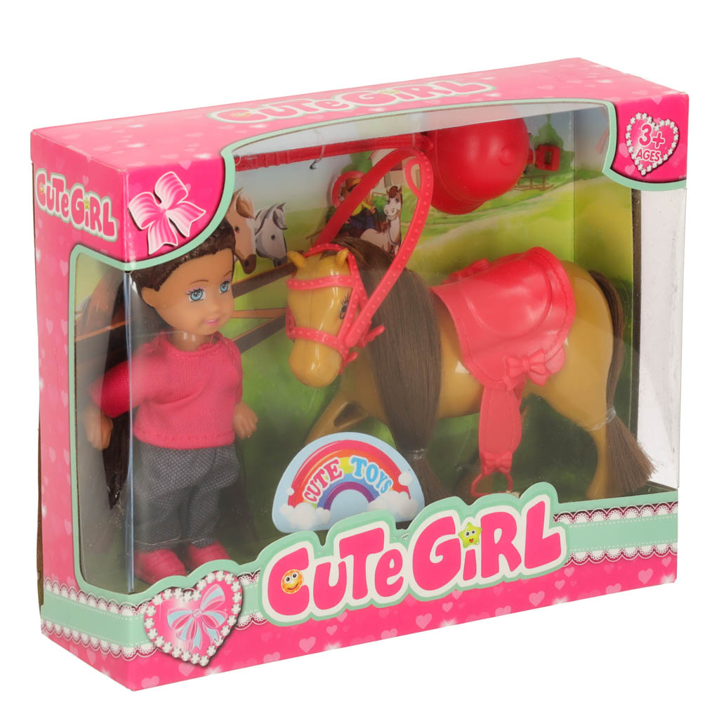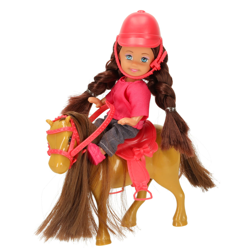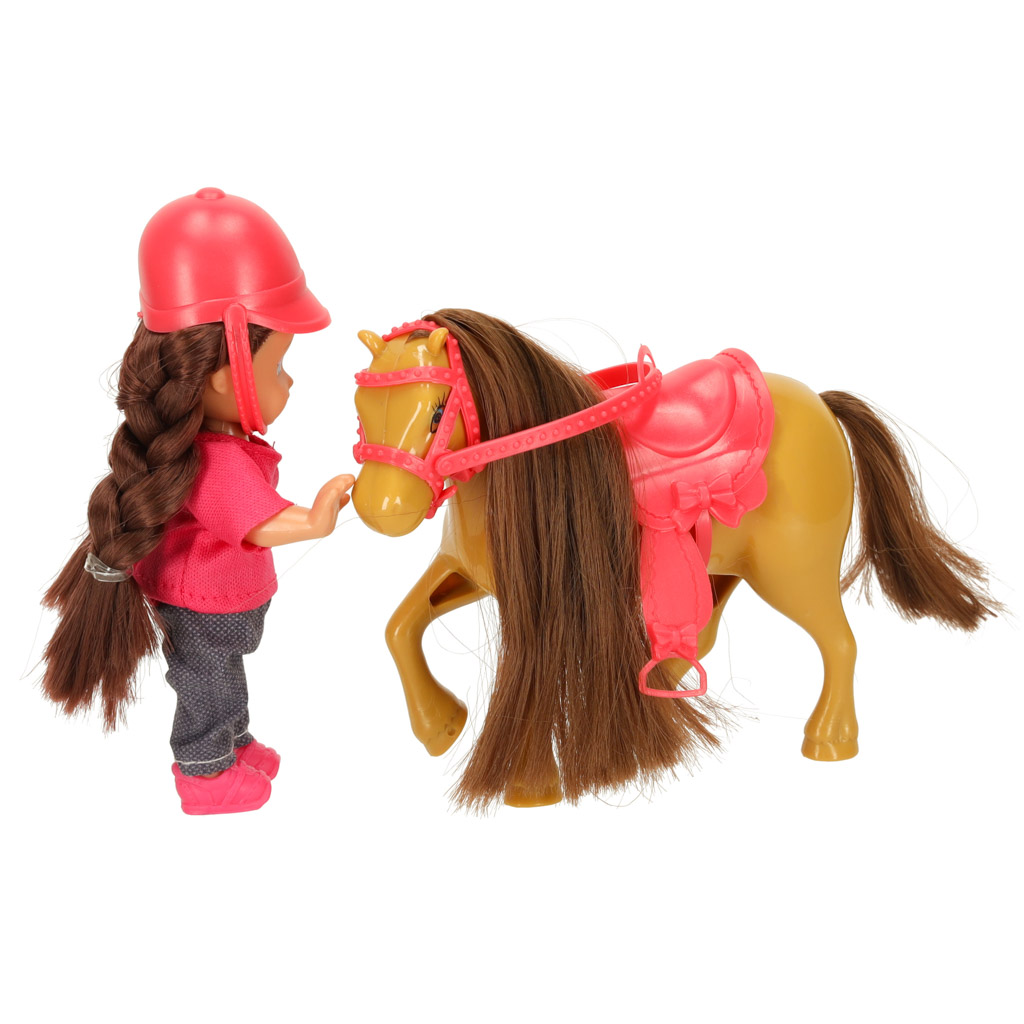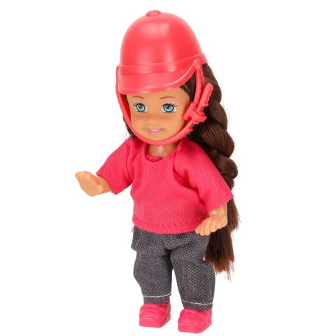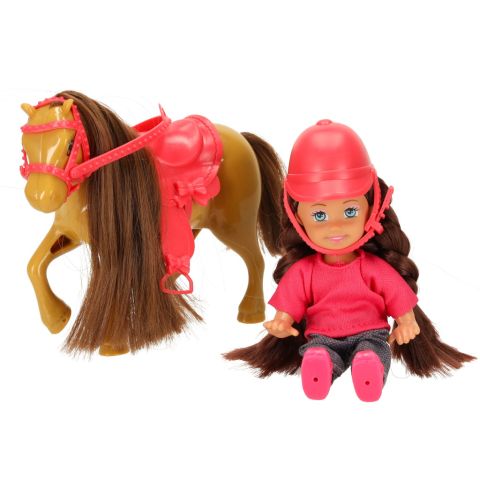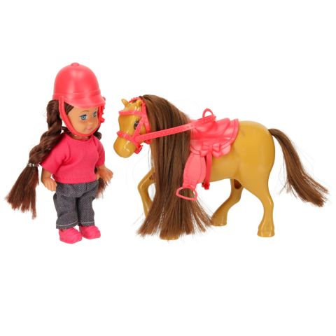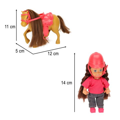 Zabawkowy komplet umieszczony w pudełku z okienkiem. Zestaw zawiera lalkę, konika, czapkę, siodło i lejce. Lalka ma ruchome elementy, przez co można ją posadzić na grzbiecie konia. Wymiary opakowania: 20,5 cm x 6 cm x 16 cm, kolor: brązowo-różowy