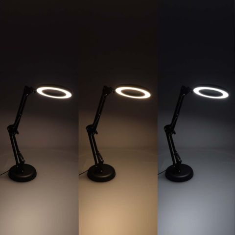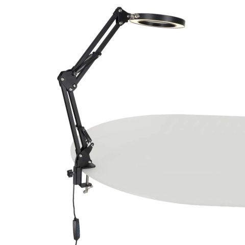 Lampka biurkowa LED z lupą x3, 72 diody SMD2835, 3 barwy światła (3500–6000K), regulacja jasności w 10 stopniach, CRI >80. Zasilanie USB 5V/12W, stabilny klips, przewód z panelem sterowania, kolor czarny.