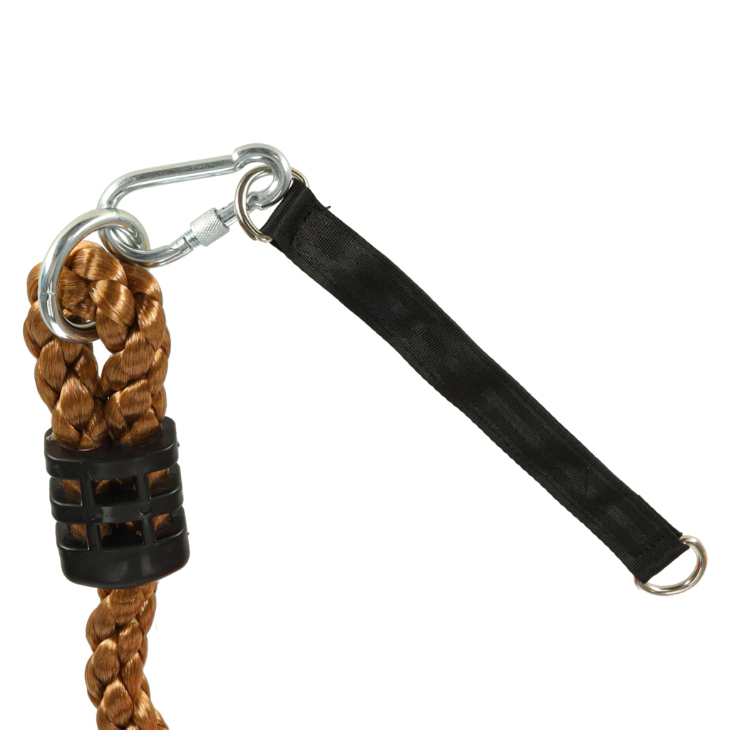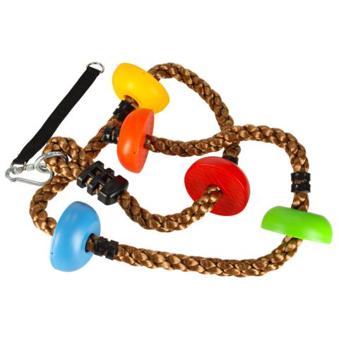 Lina wspinaczkowa z tworzywa PE o długości 210 cm i średnicy 2,6 cm. Wyposażona w 5 antypoślizgowych dysków (średnica 10,5 cm) i metalowy haczyk montażowy. Odporna na UV i wilgoć, do użytku zewnętrznego i wewnętrznego. Maks. obciążenie 100 kg.