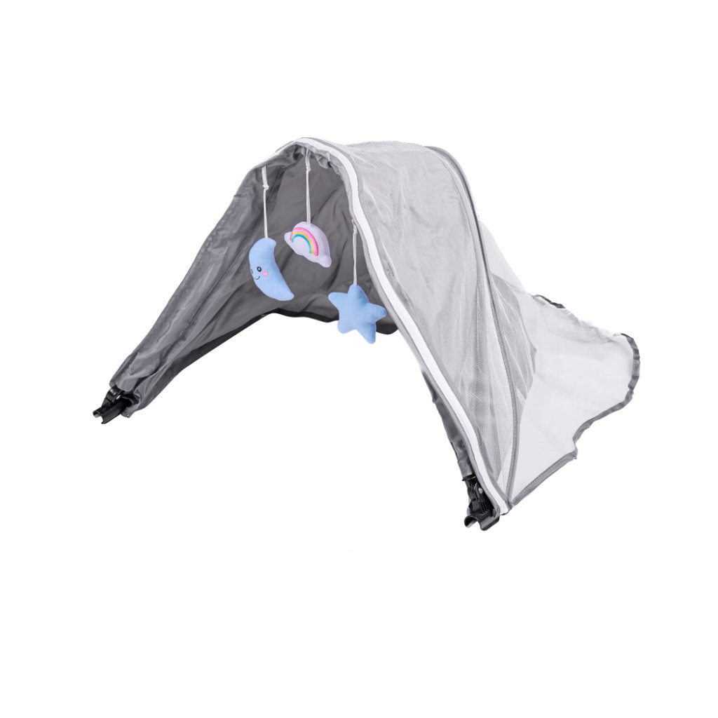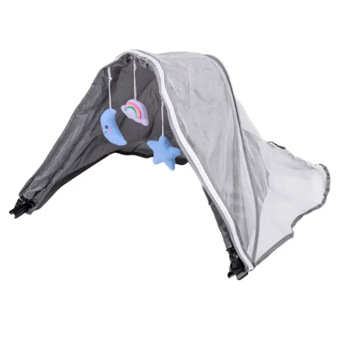- Daszek z moskitierą i pluszakami – chroni przed owadami i zapewnia dziecku atrakcję