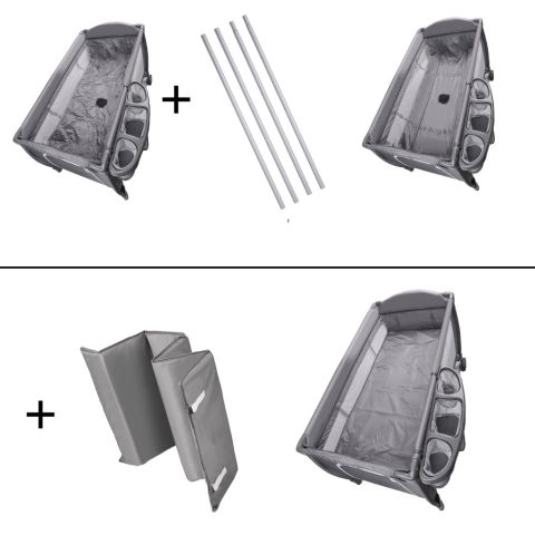 Łóżeczko ma w zestawie między innymi doczepiane drugie piętro oraz przewijak z kieszonkami. Takie udogodnienia dodają mu funkcjonalności, dzięki czemu sprawdzi się na krótkie i dłuższe wyjazdy. Konstrukcja w kształcie litery X, stopki antypoślizgowe oraz kółeczka z blokadą sprawiają, że łóżko jest praktyczne i stabilne. Przemyślanie rozplanowane kieszenie i schowki ułatwią rozpakowanie oraz organizację bagażu. Łóżko z przewijakiem zapewnia komfort przy przebieraniu i przewijaniu maluszka.