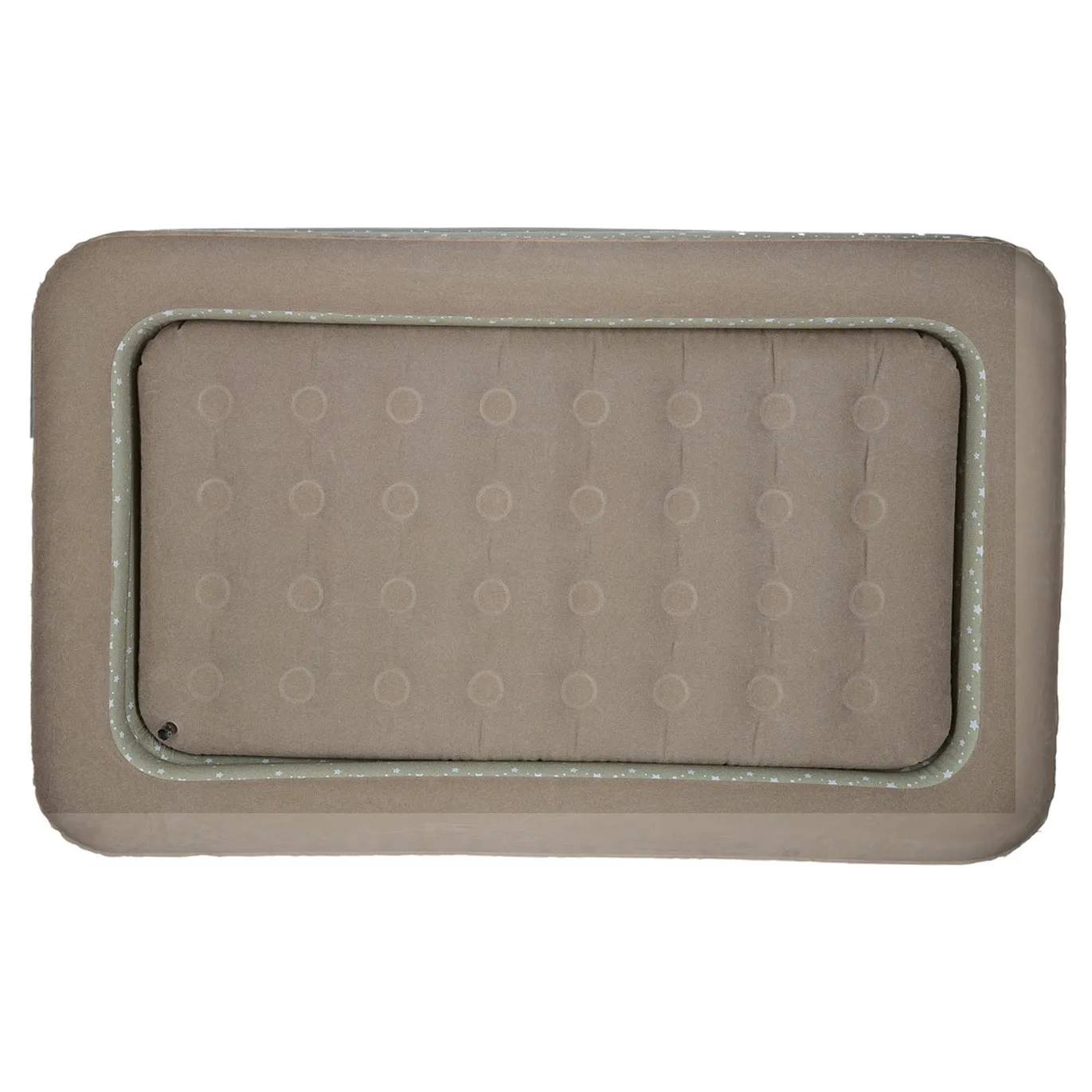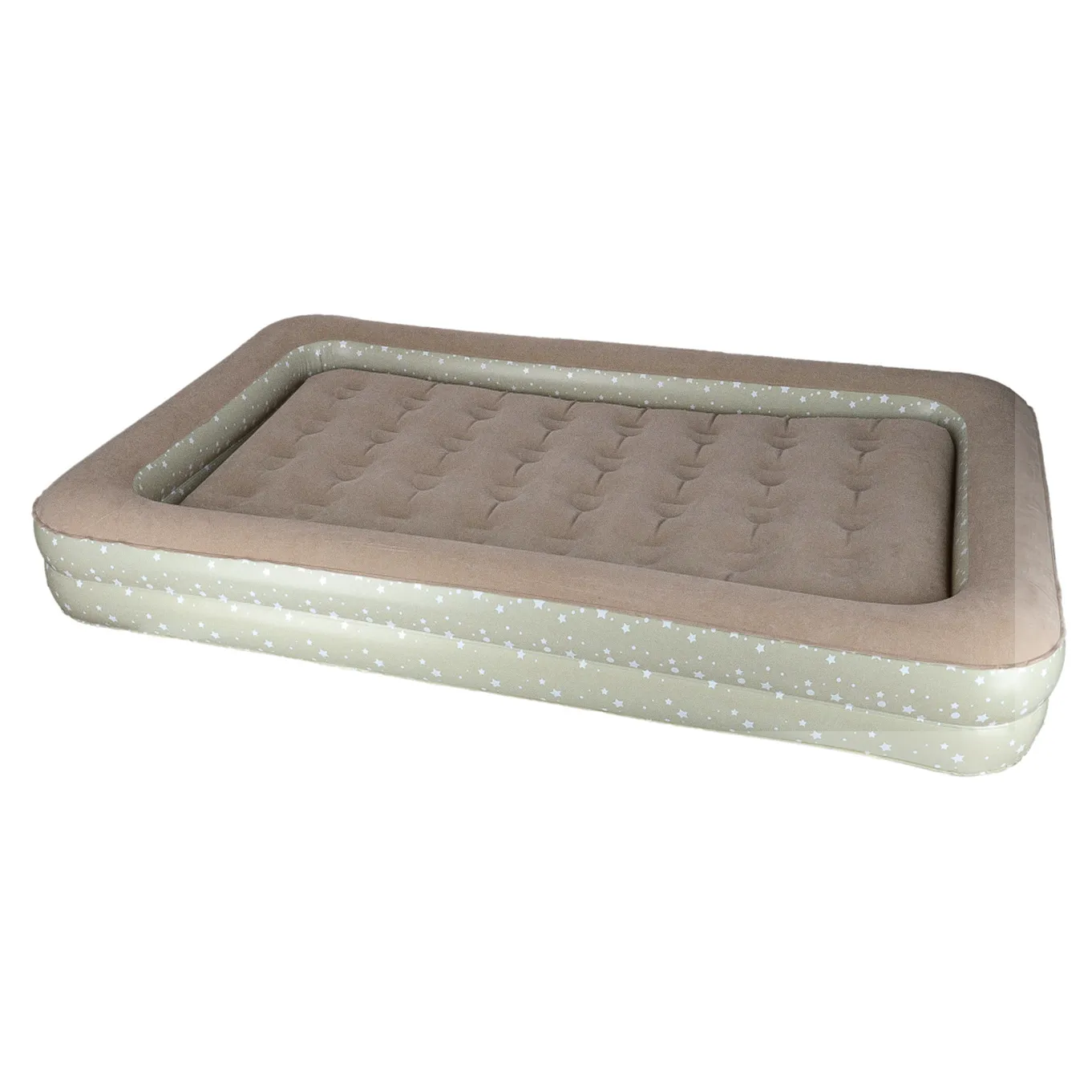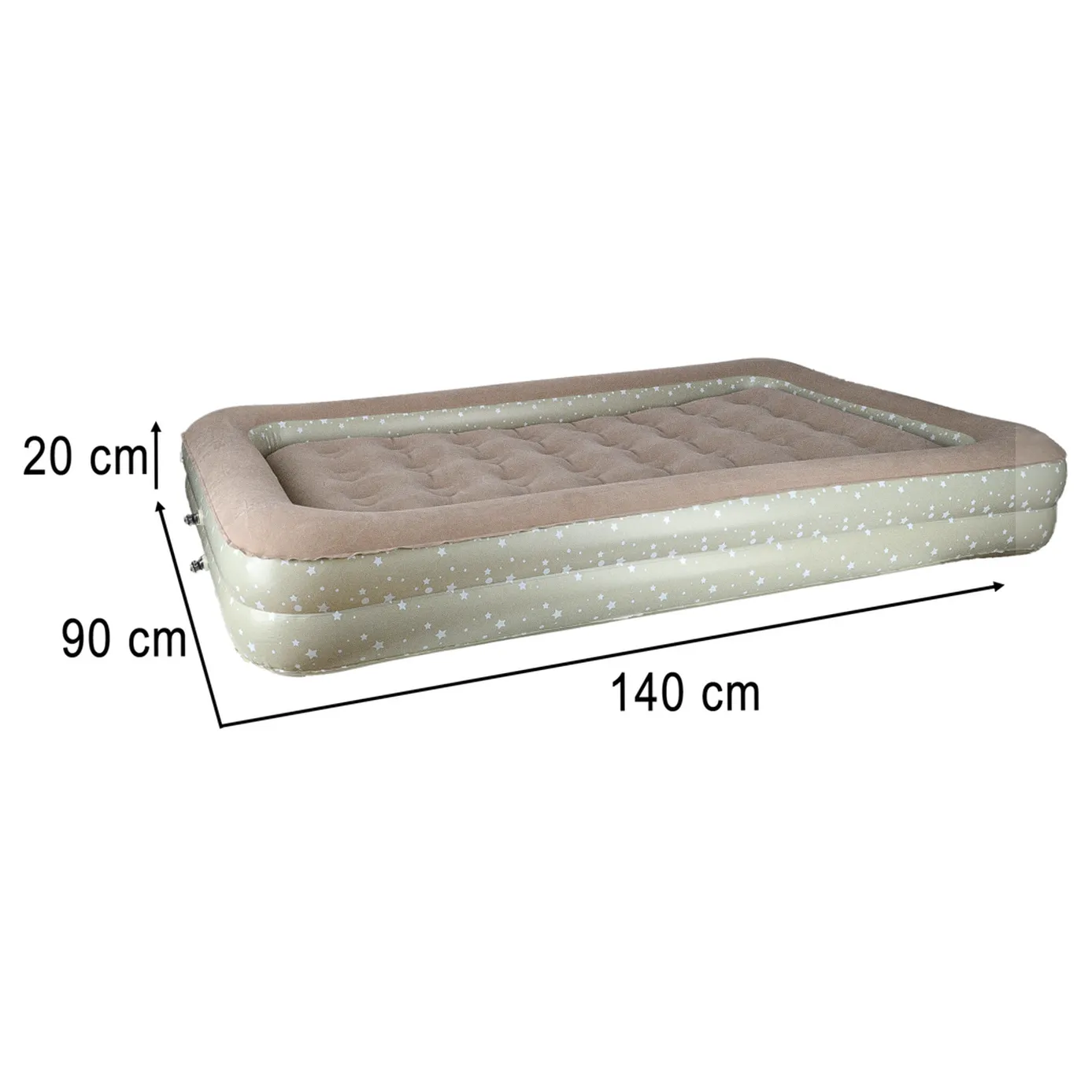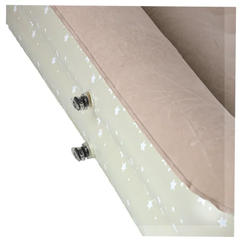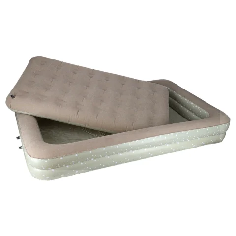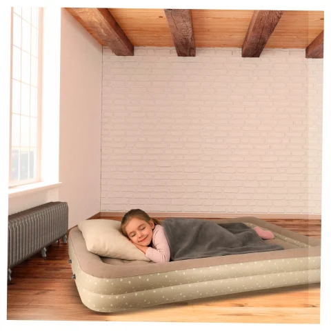 Dwuczęściowe turystyczne łóżko dziecięce w kolorze popielatym do napompowania. Przydatne podczas nocowania poza domem lub na wakacjach. W zestawie ergonomiczna pompka z trzema końcówkami. Wymiary: 140 cm x 90 cm x 20 cm