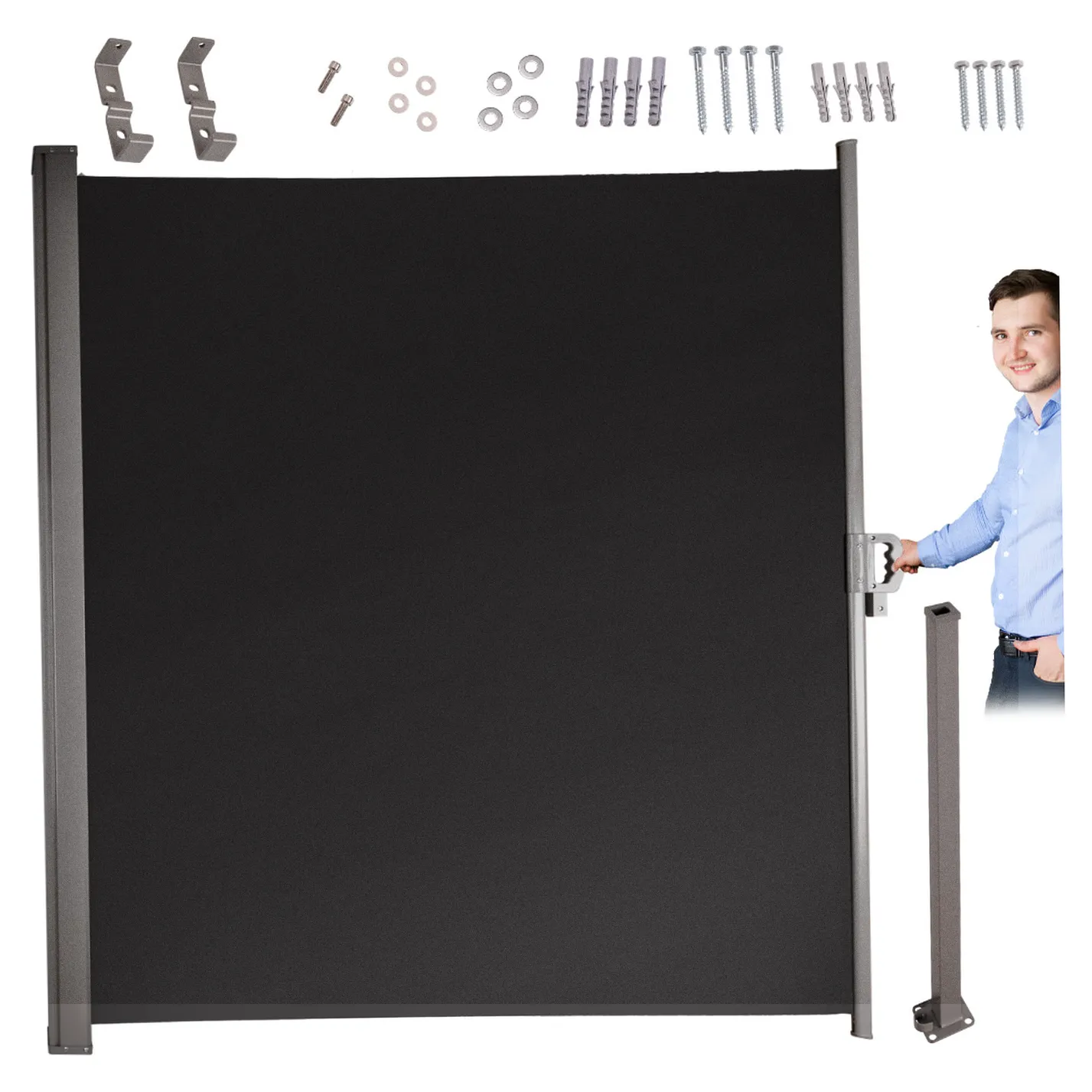 Kolor: Szary. Wymiary parawanu ogrodowego: Wysokość parawanu: 160cm. Szerokość parawanu: 300cm. Szerokość wysuwanego materiału: 151cm. Wysokość materiału: 146cm. Wymiary rury mocującej: Grubość rury: 4x4cm. Wysokość: 80cm. Wymiary podstawy (dolnej części)