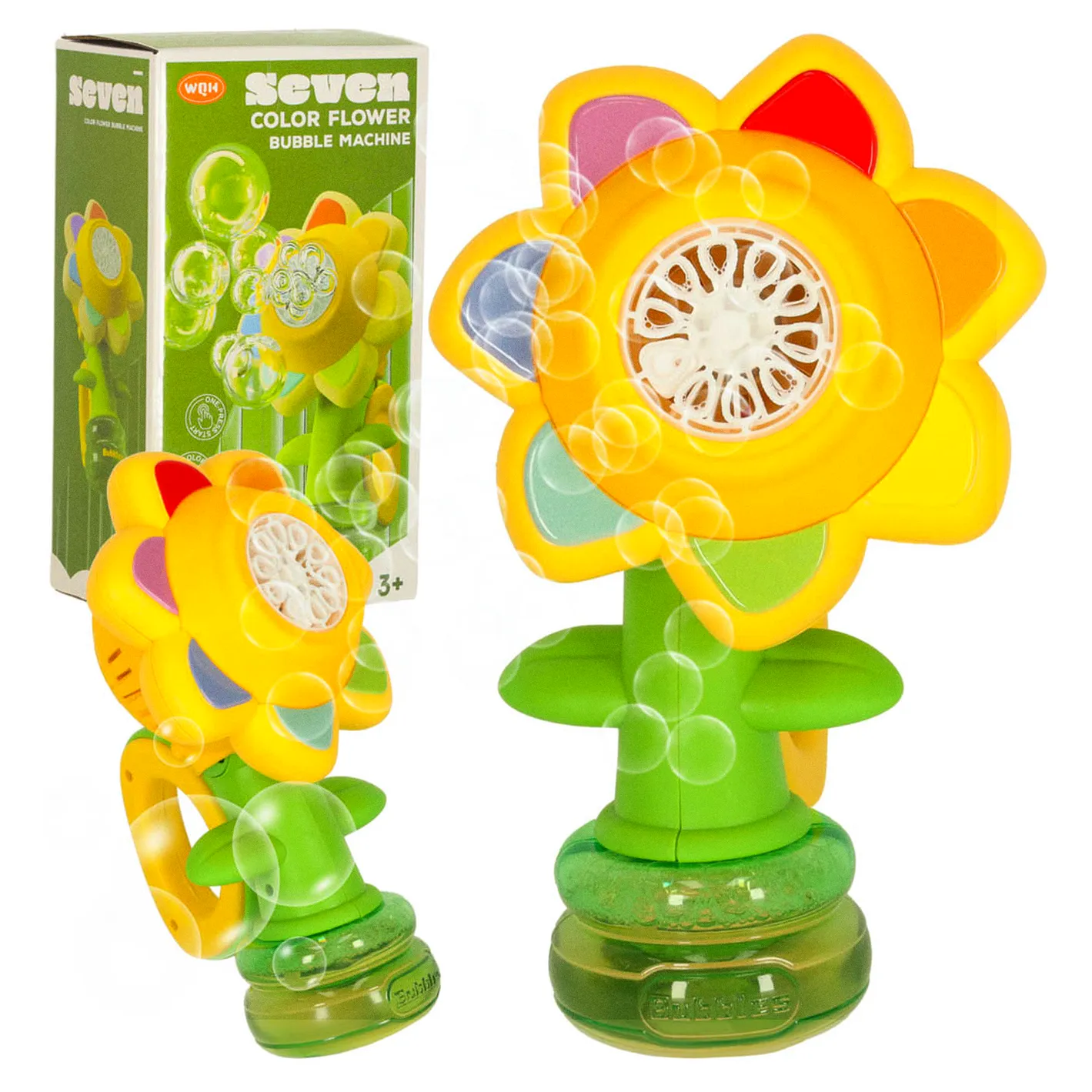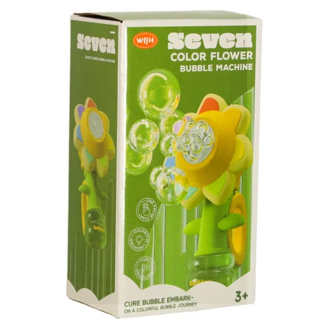 Automatyczna maszyna do baniek mydlanych w kształcie kwiatka działa na akumulator 3,7 V 500 mAh z ładowaniem USB. Generuje setki baniek jednocześnie, posiada efekty świetlne, solidną obudowę z plastiku i praktyczny uchwyt do wygodnej zabawy.