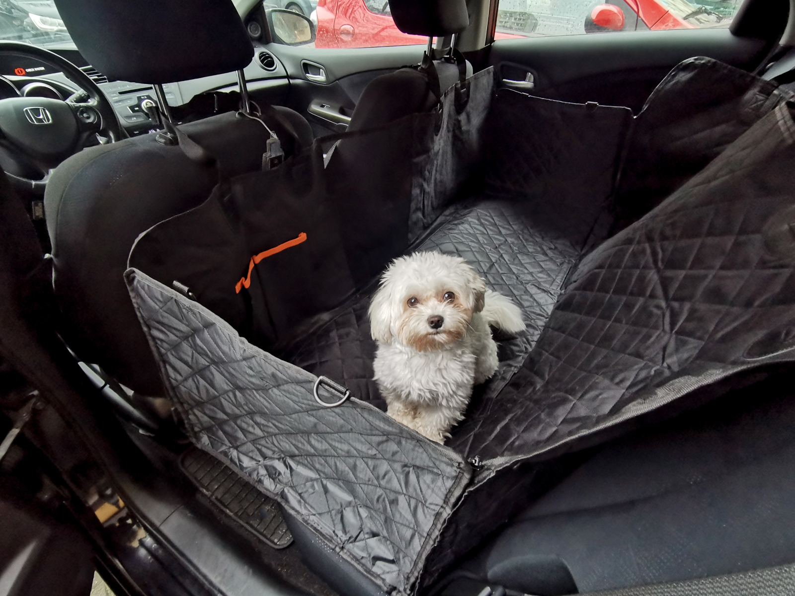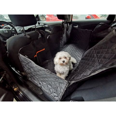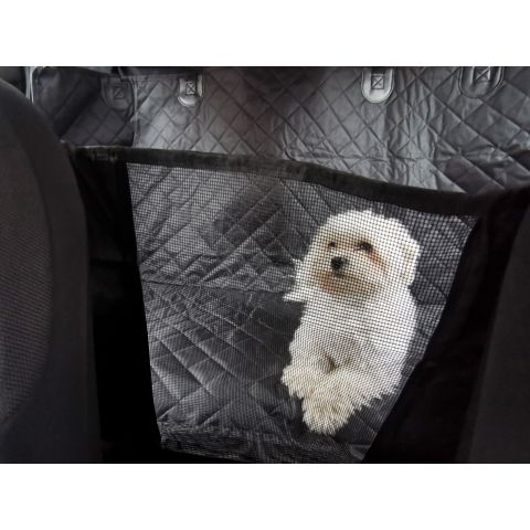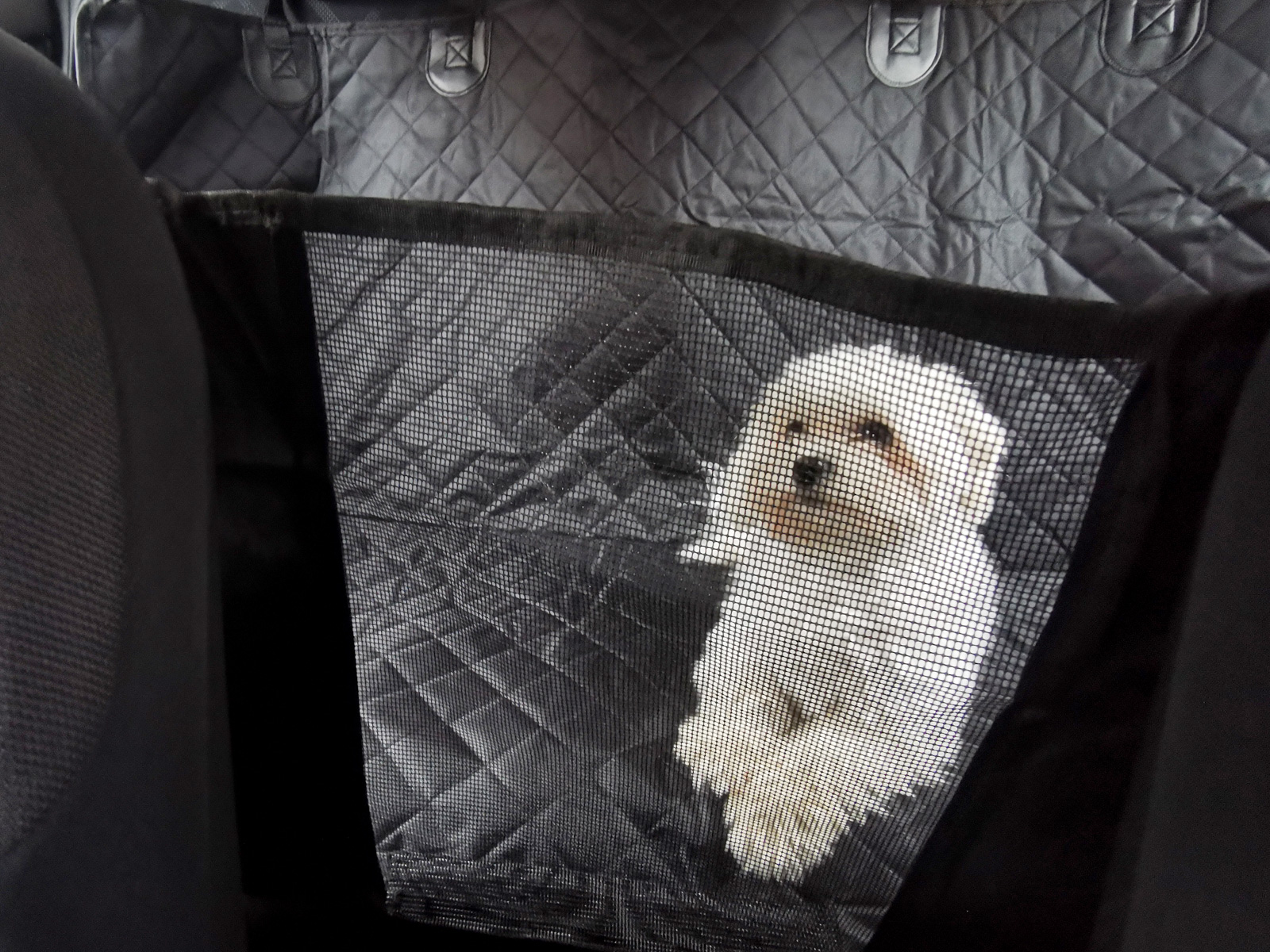 Z przodu maty – pomiędzy przednimi siedzeniami zamontowano siatkę, dzięki czemu zwierzak może widzieć swojego właściciela i patrzeć na drogę, ale nie ma możliwości przejść na przednie siedzenia.
