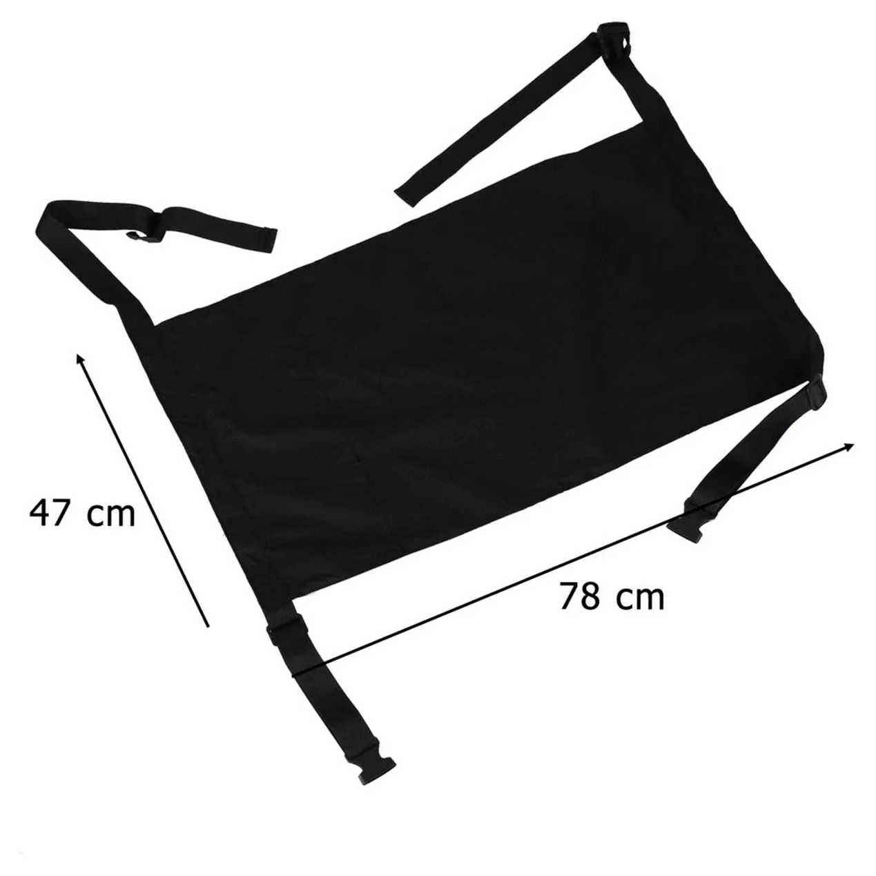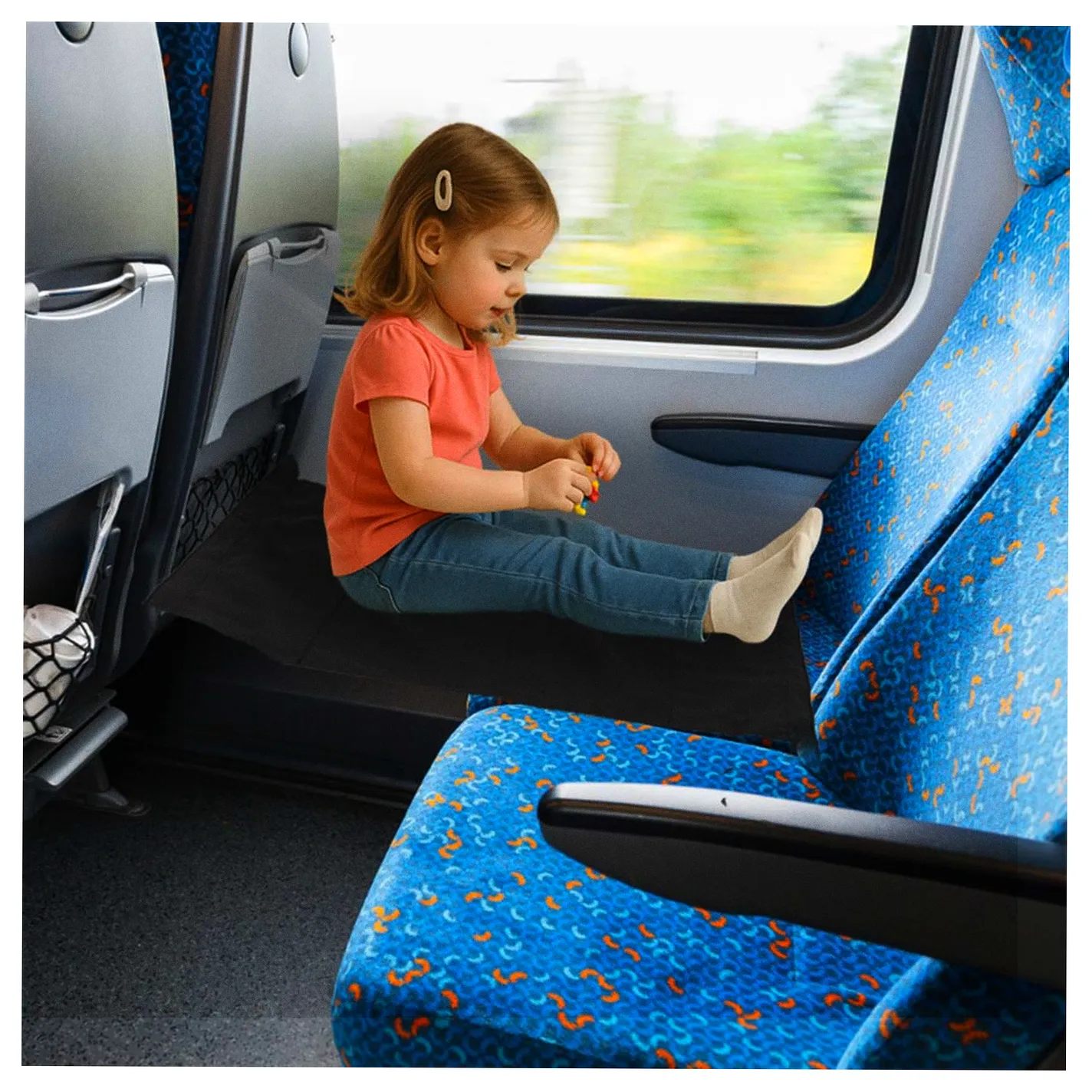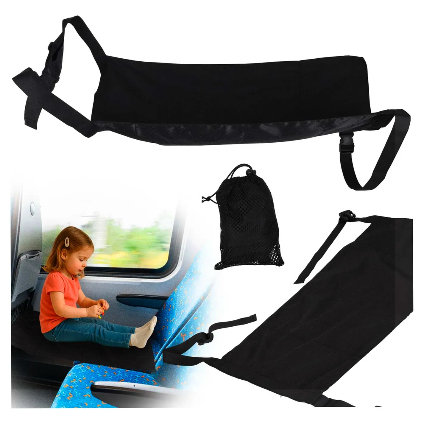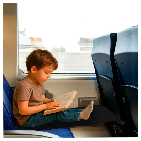 Praktyczny dziecięcy leżak podróżny do zawieszenia między fotelami w pociągu lub w samolocie. Regulowane zapięcie na klamry zatrzaskowe zapewnia najmłodszym komfort podczas długich podróży. Wymiary maty: 47 x 78 cm, kolor: czarny.