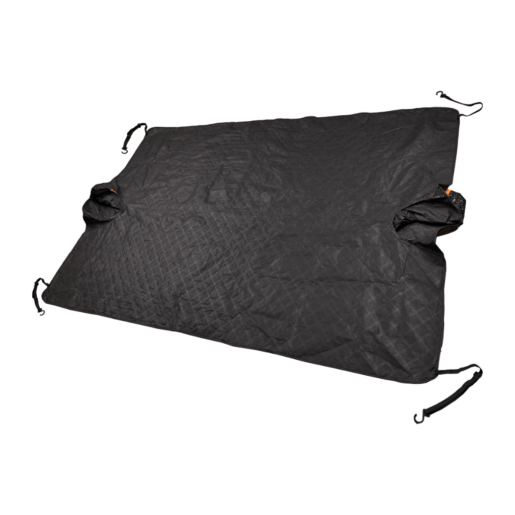 Osłona posiada 12 wszytych magnesów (wzdłuż wszystkich krawędzi), które pewnie trzymają ją na miejscu. Zaczepiania haczykowe do felg dodatkowo gwarantują, że mata nie zsunie się nawet podczas mocnego wiatru.