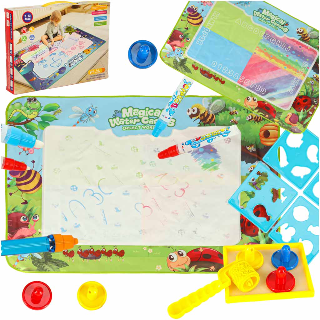 Mata wodna z akcesoriami gotowa do akcji!Nasz bogaty zestaw do malowania wodą to kompletne studio artystyczne w jednym! Znajdziesz w nim wszystko, czego potrzeba dziecku do natychmiastowego rozpoczęcia twórczych podbojów: dużą matę wodną do malowania, mazaki napełniane wodą, kreatywne stemple, wałek, szablony i zeszyt z inspiracjami. To idealny wybór na prezent dla dzieci od 3. roku życia, gwarantujący godziny fascynującej, kreatywnej zabawy i rozwijający artystyczne talenty.
