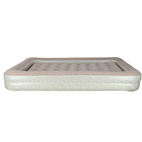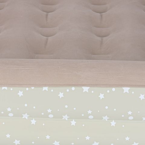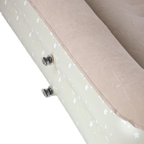 Dmuchany materac do spania dla dzieci jest praktyczny, a zarazem wygodny. Posiada praktyczne dwuczęściowe zawory, które ułatwiają pompowanie materaca oraz zapobiegają gwałtownemu ujściu powietrza na zewnątrz. Materac jest wykonany z trwałego materiału PVC – u góry ma miękką fakturę przypominającą welur, zaś po bokach ma wzór w drobne gwiazdki.