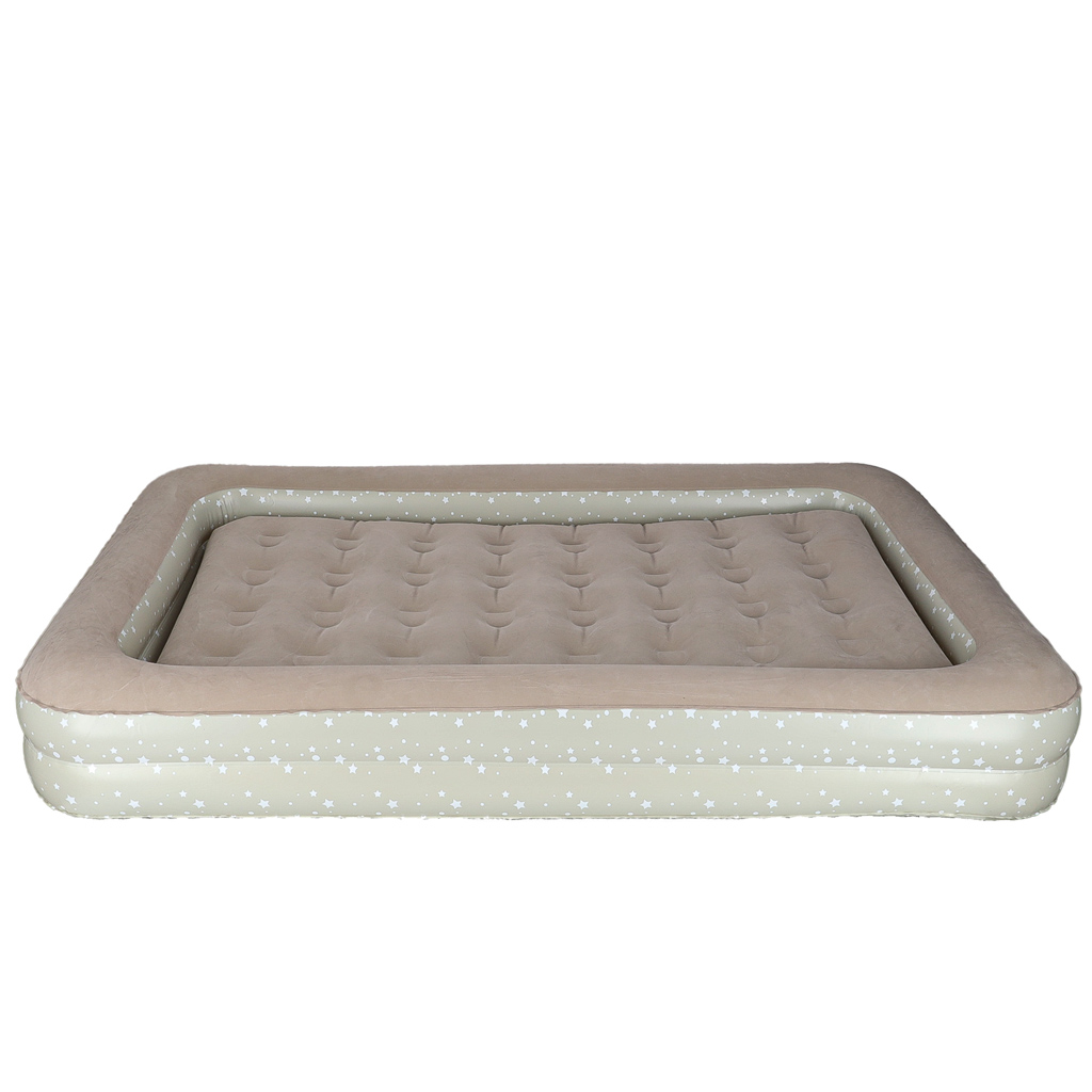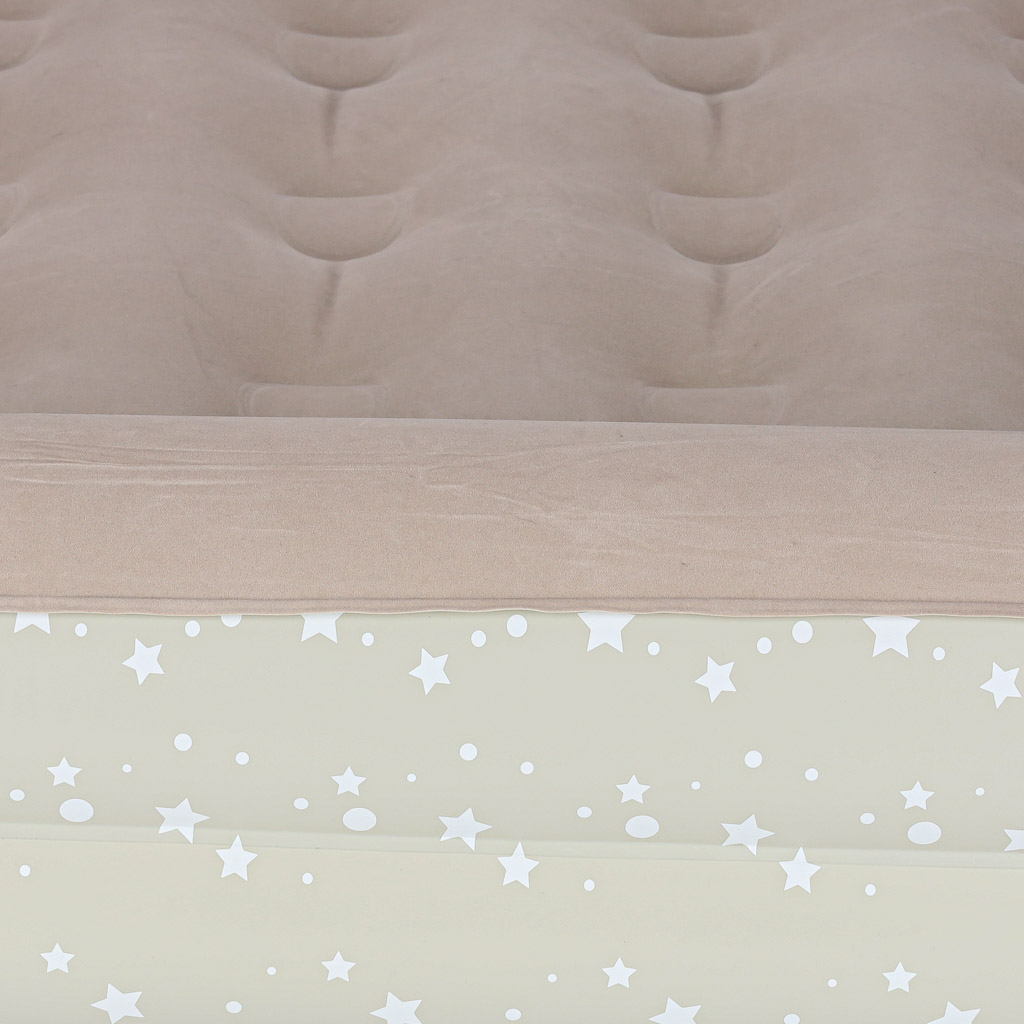 Dmuchany materac do spania dla dzieci jest praktyczny, a zarazem wygodny. Posiada praktyczne dwuczęściowe zawory, które ułatwiają pompowanie materaca oraz zapobiegają gwałtownemu ujściu powietrza na zewnątrz. Materac jest wykonany z trwałego materiału PVC – u góry ma miękką fakturę przypominającą welur, zaś po bokach ma wzór w drobne gwiazdki.