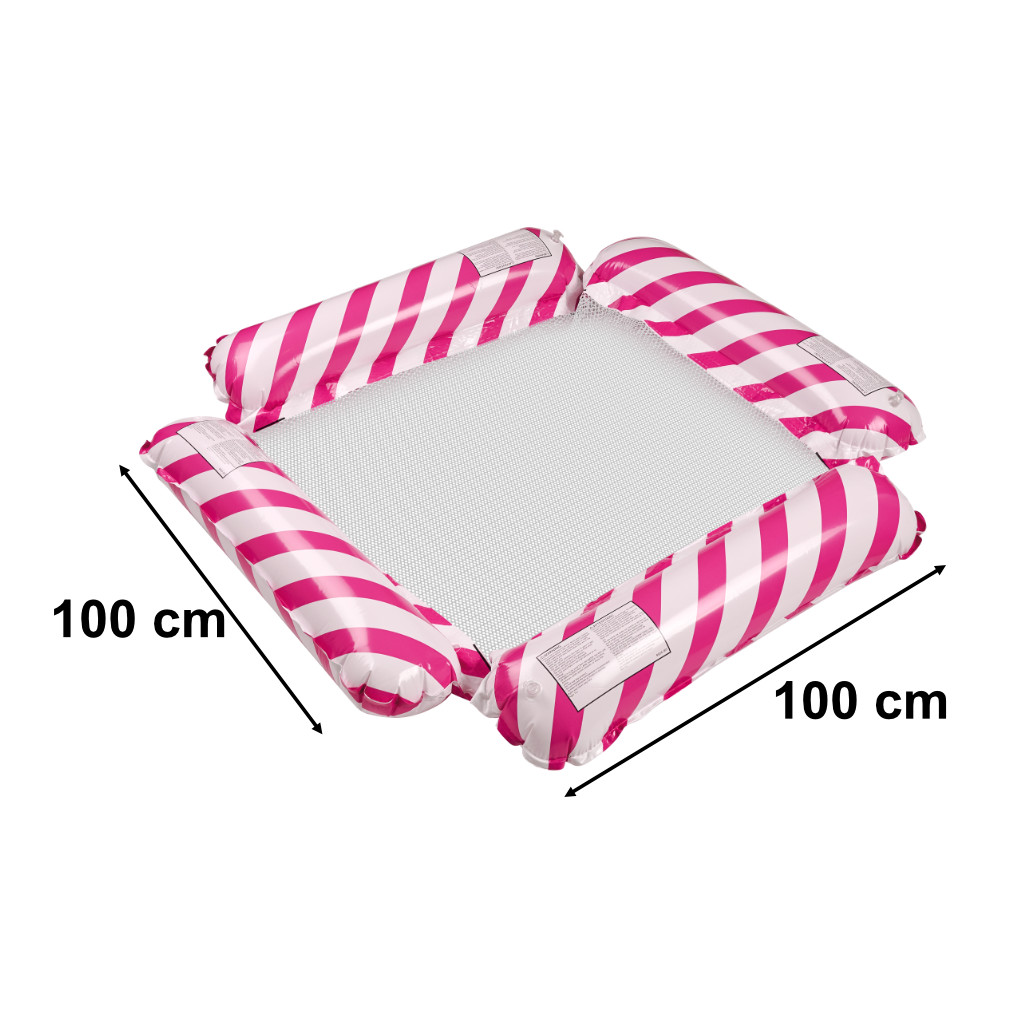 Dmuchany materac wodny 3w1: fotel i leżak. Wykonany z PVC i siatki, wymiary 100×100 cm, obciążenie do 70 kg. Stabilna wyporność, lekka konstrukcja, szybkie pompowanie. Do basenu, jeziora, morza.