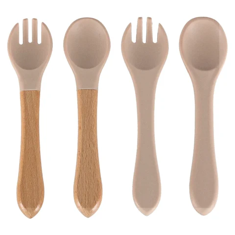 • Silikonowe sztućce (widelec i łyżeczka) oraz pierwsze sztućce z drewnianym uchwytem