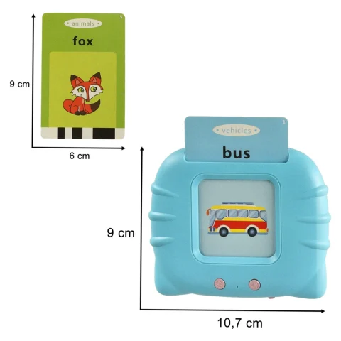 Niebieski czytnik kart edukacyjnych do nauki języka angielskiego. Produkt gra słowo z karty, co pozwala na naukę nowych słówek i ich wymowy. Ilość kart: 112 (dwustronne). Zasilanie: akumulator 300 mAh. Czas działania: 4-5 godzin. Wym: 10,7 x 9 x 2,1 cm.