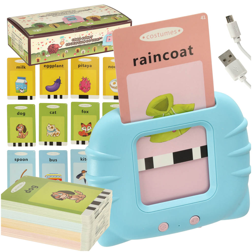 Każda karta posiada dwa wgrane słowa, po jednym na każdą stronę, oraz odpowiedni rysunek, który pozwala zrozumieć ich znaczenie. Stymuluje to zarówno wzrok i słuch dziecka, dzięki czemu z pewnością dopasuje się do najefektywniejszego sposobu uczenia się każdego malucha.