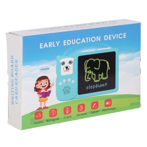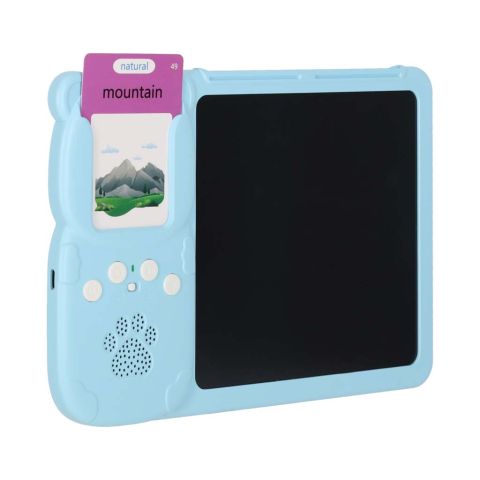 Edukacyjny czytnik kart z funkcją dźwięku i tabletem znikopis. Zestaw zawiera 112 dwustronnych kart edukacyjnych. Urządzenie wyposażone w przycisk REPEAT, regulację głośności, funkcję ścierania i blokady. Zasilanie USB, ekran 8”, głośnik 1W/8om