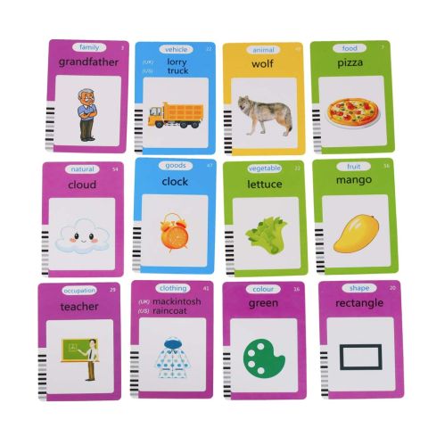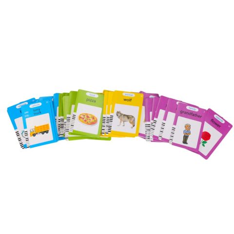 Zestaw obejmuje aż 112 dwustronnych kart – to ogromny, szeroki zakres słownictwa, który pomoże dziecku rozwijać język i zrozumieć podstawy nauki języków obcych w sposób przyjazny i ciekawy. Zestaw zawiera karty przedstawiające zwierzęta, pojazdy, kolory, rodzinę, ubrania, zawody, środowisko, owoce, warzywa, jedzenie i przedmioty codziennego użytku. Dzięki temu nauka nowych słów nigdy się nie nudzi!