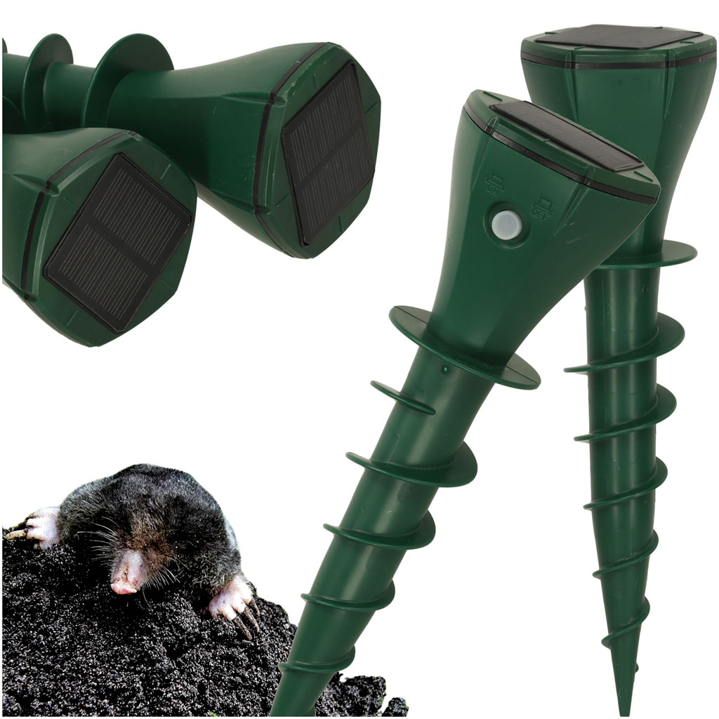 Wibracyjny odstraszacz solarny na krety i nornice, zasilany energią słoneczną. Urządzenie emituje fale wibracyjne. Trzy tryby pracy. Zasięg działania do kilkuset m2. Wodoodporna obudowa, prosty montaż, bezobsługowa praca całoroczna.