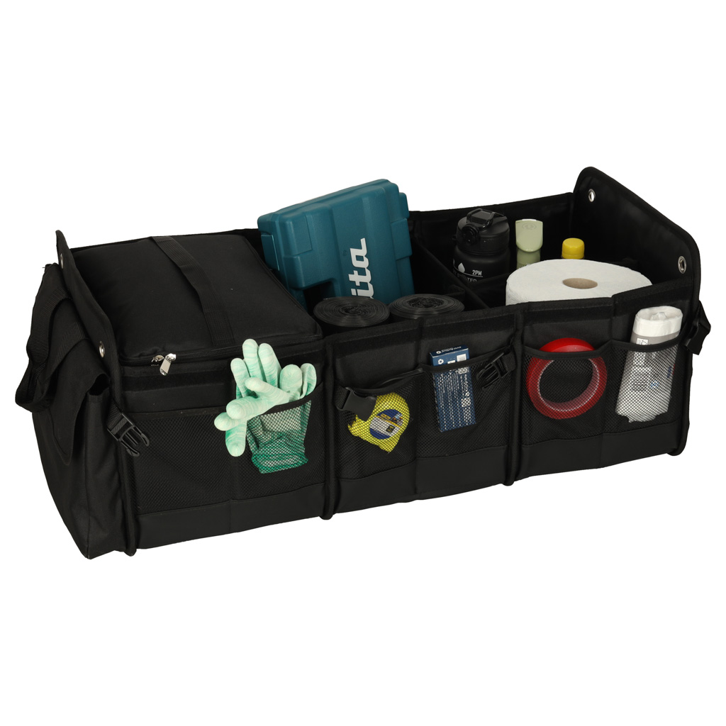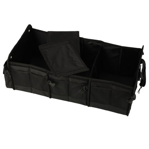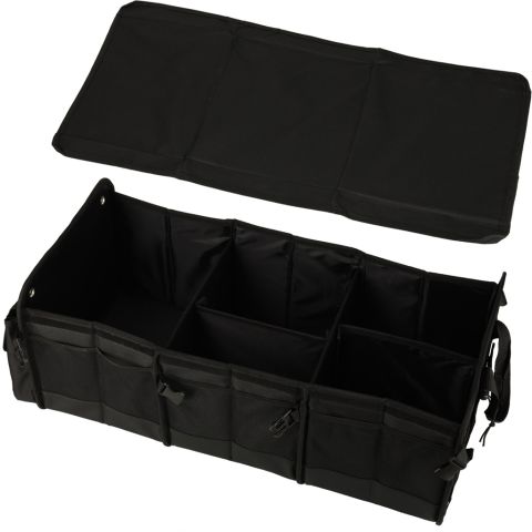 Wodoodporny organizer do bagażnika auta z klapą i regulowanymi przegródkami. W wyposażeniu ma wyjmowaną torbę termiczną przeznaczoną do produktów chłodniczych. Wymiary: 37 cm x 75 cm x 32 cm, kolor: czarny