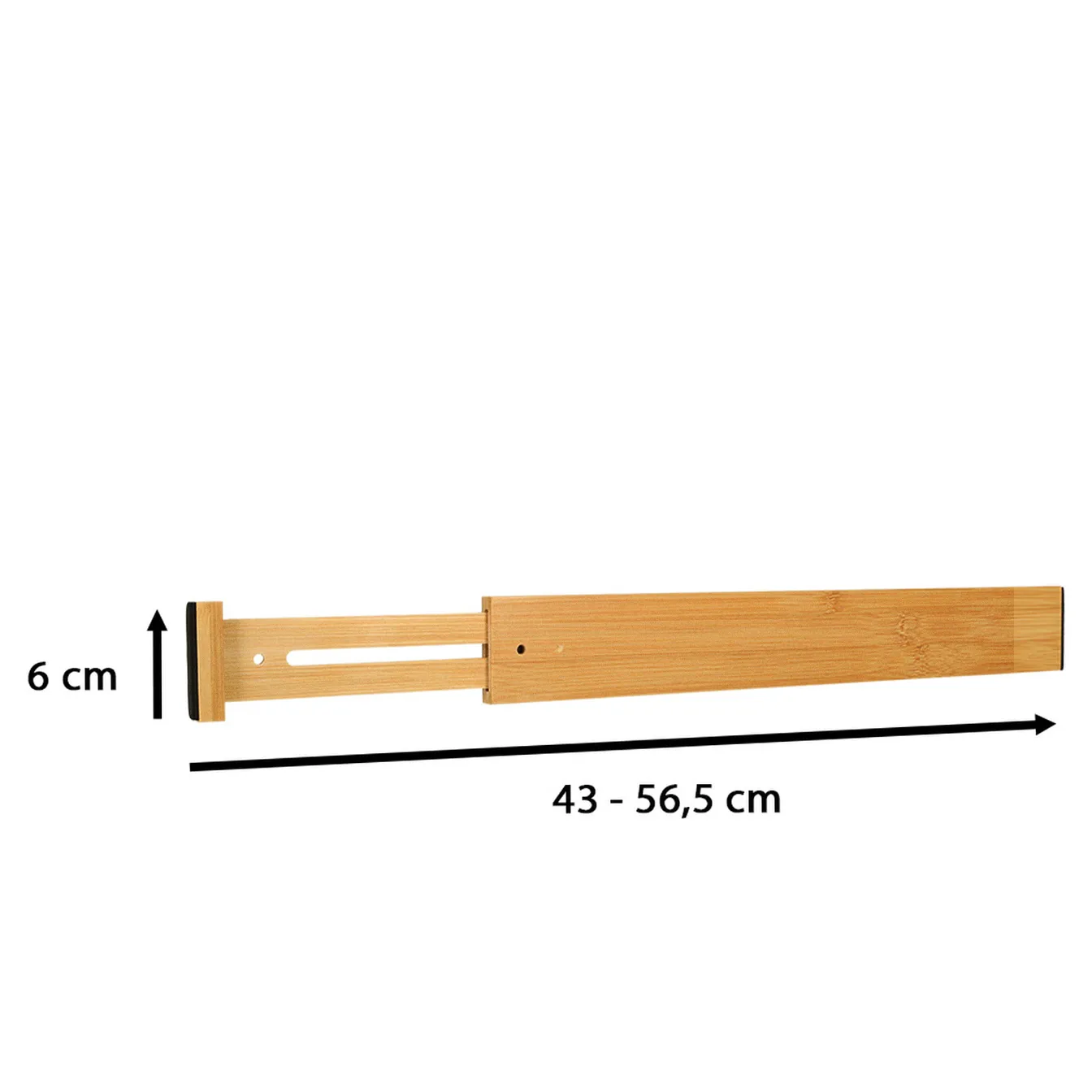 Bambusowy separator do szuflad – ułatwia rozdzielenie i zorganizowanie rzeczy w dużych szufladach. Na brzegach separatora znajduje się gąbka zapobiegająca rysowaniu szuflady. Kolor: biały. Maksymalna długość: 56,5 cm. Wysokość: 6 cm.